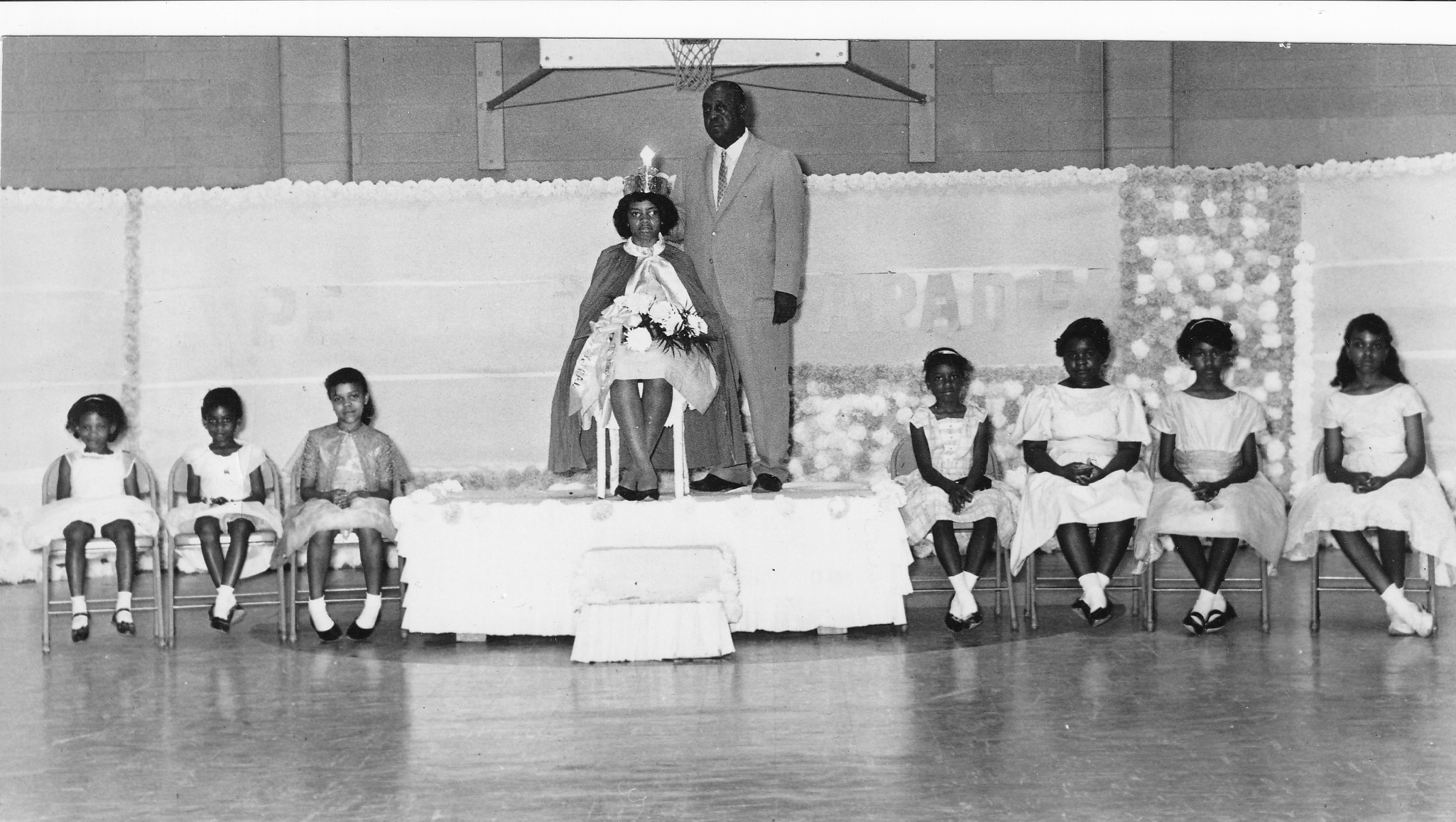 Professor W. B. Wicker crowns eighth-grade student Margaret Bagley "Physical Education Queen" of W. B. Wicker School. Members of the court are (L-R): Claudia McMillan, Donna Brown, Myrtise Harris, Karen Crumpton, Alice Jones, Diannette McLeod, and Linda Reives.