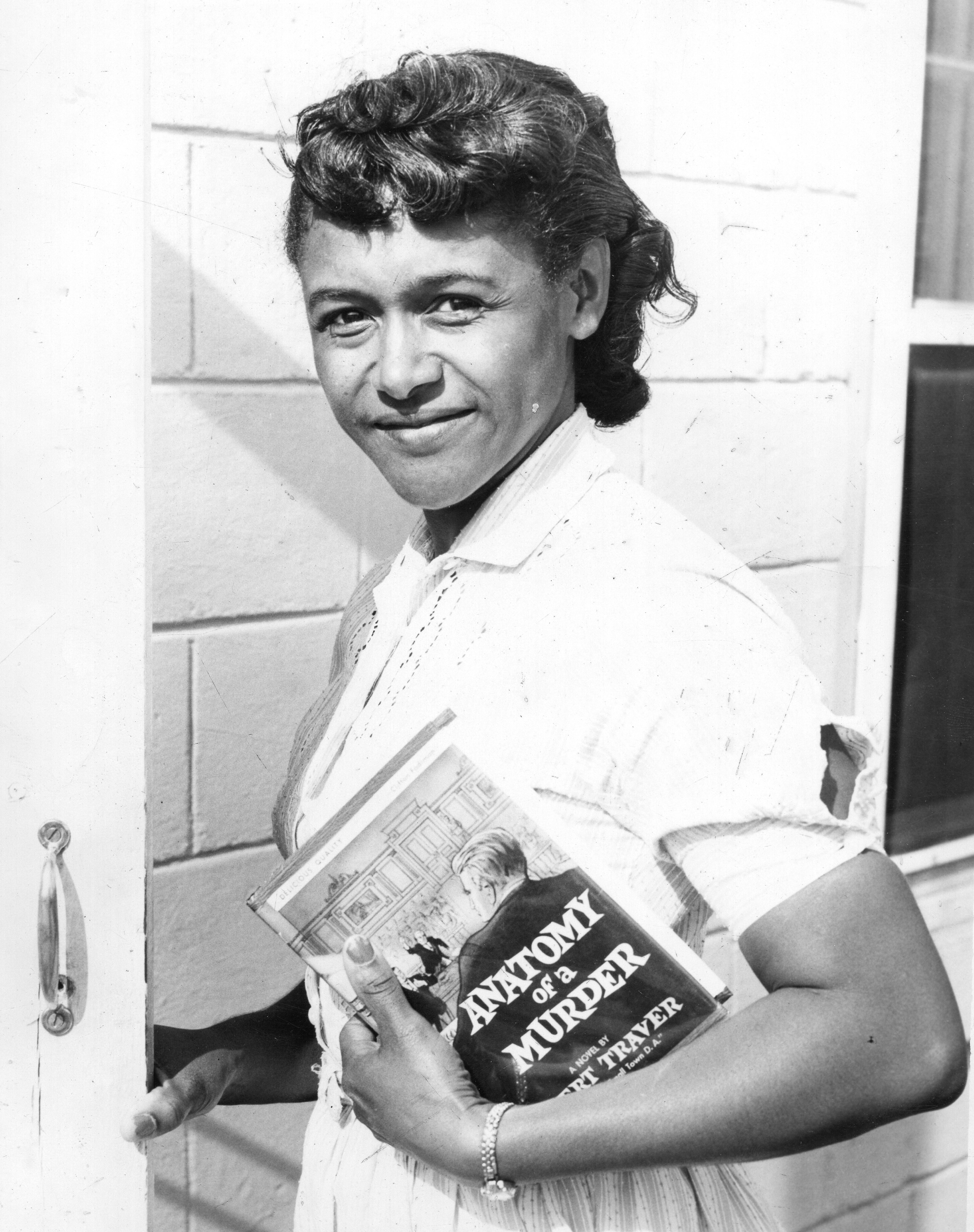 Irene White, third librarian at the Margaret P. Hoke Branch Library on Wall Street in Sanford. She poses outside the door to the library, holding a then-current bestseller.