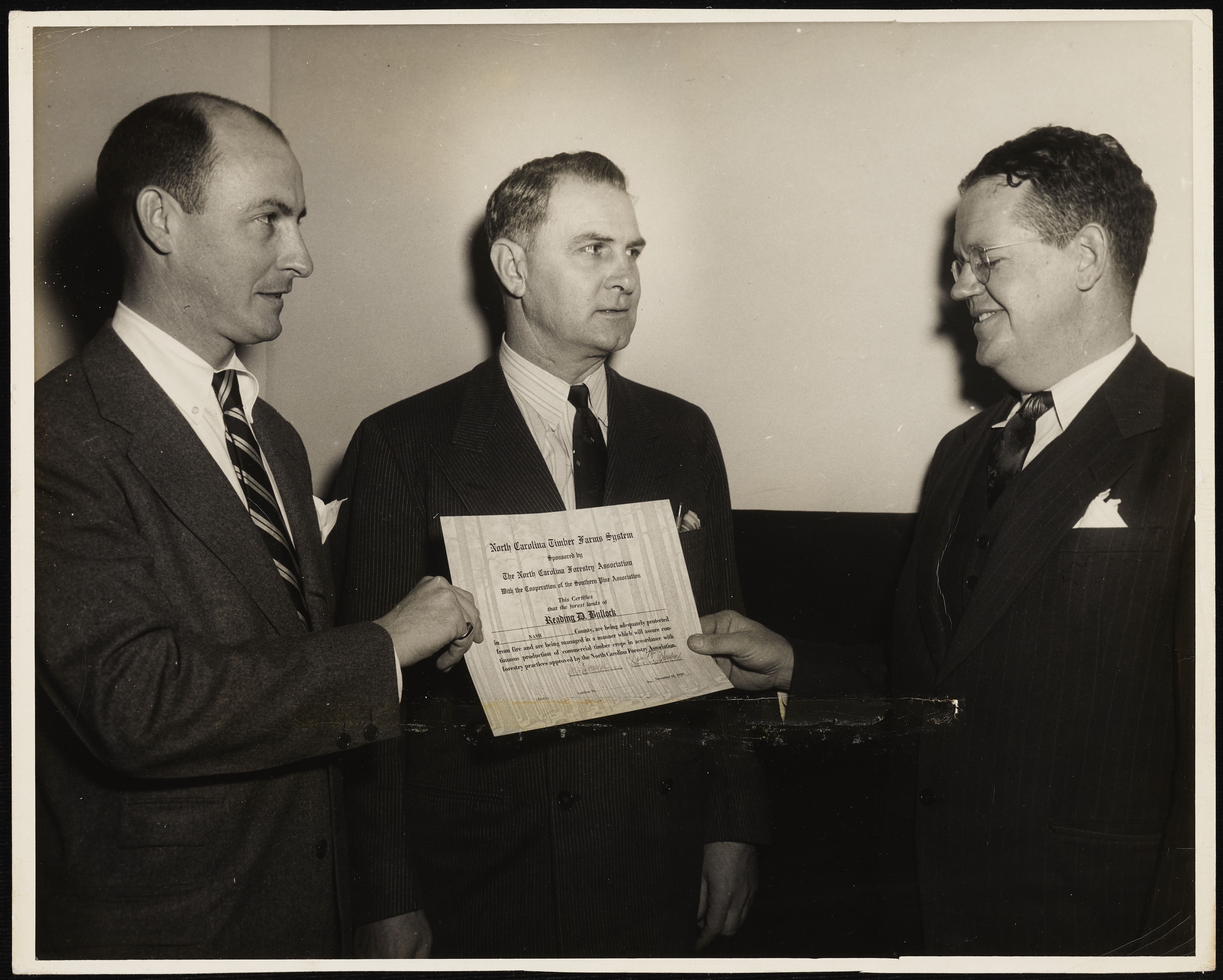 Two people stand between a third individual and hold a certificate from the North Carolina Timber Farms System certifying that the forest land owned by Reading D. Bullock is properly protected from fire and managed with industry-approved forestry practices.