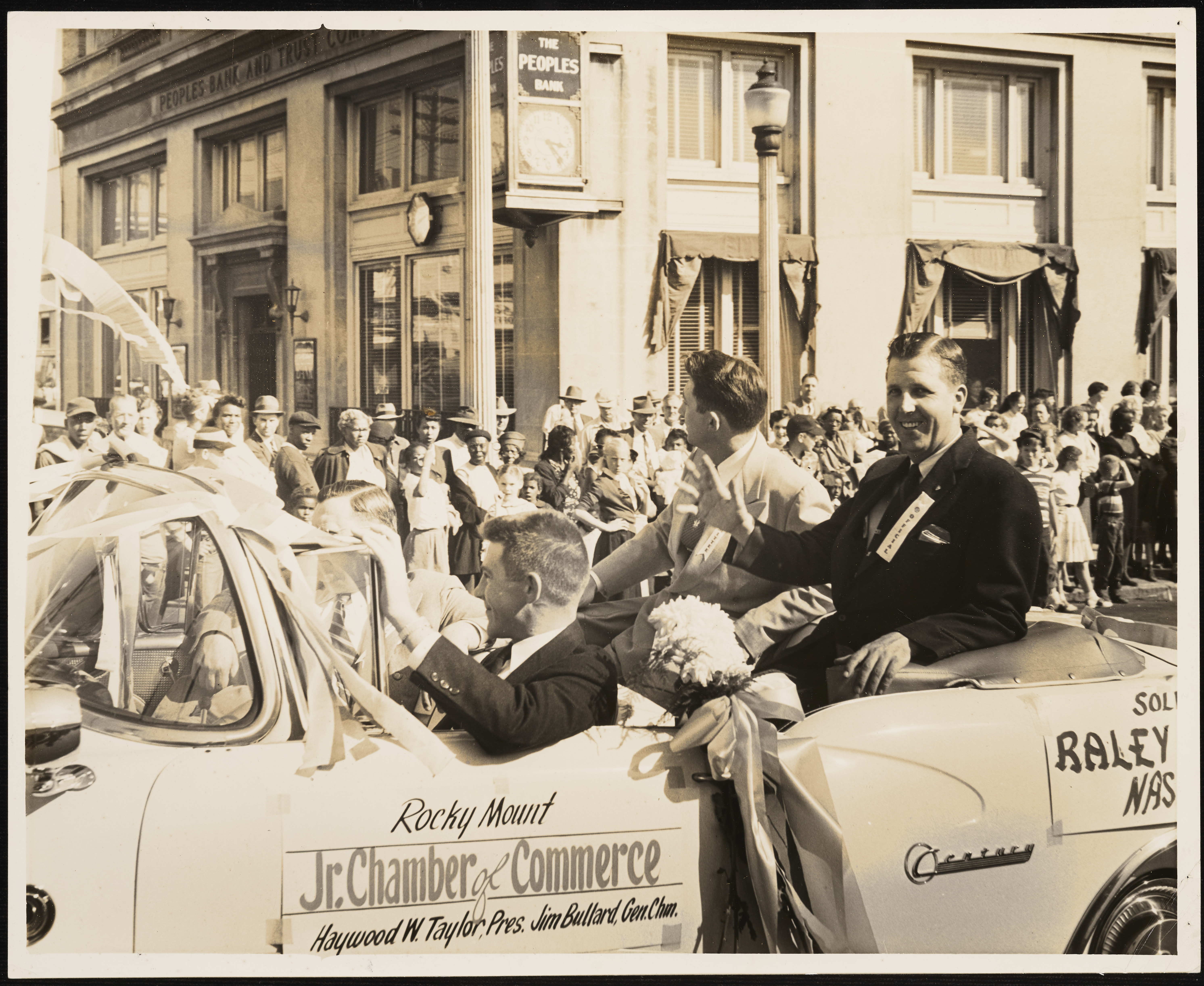 Four people in a convertible at a Safety Parade. The car is marked with a sign that says, "Rocky Mount Jr. Chamber of Commerce Haywood W. Taylor, Pres. Jim Bullard, Gen. Chm."