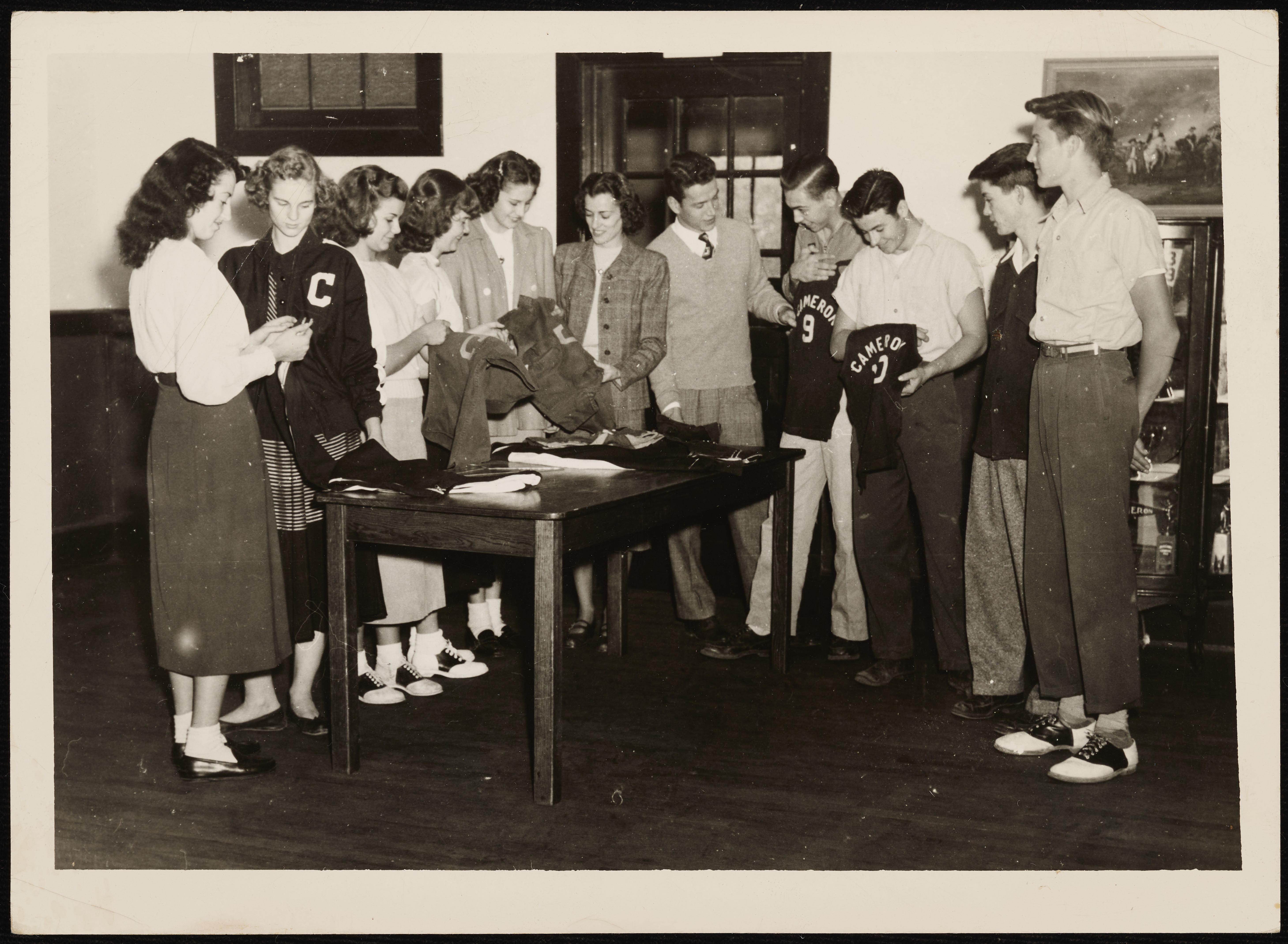 Student-athletes from Cameron High School admiring new uniforms and gear.