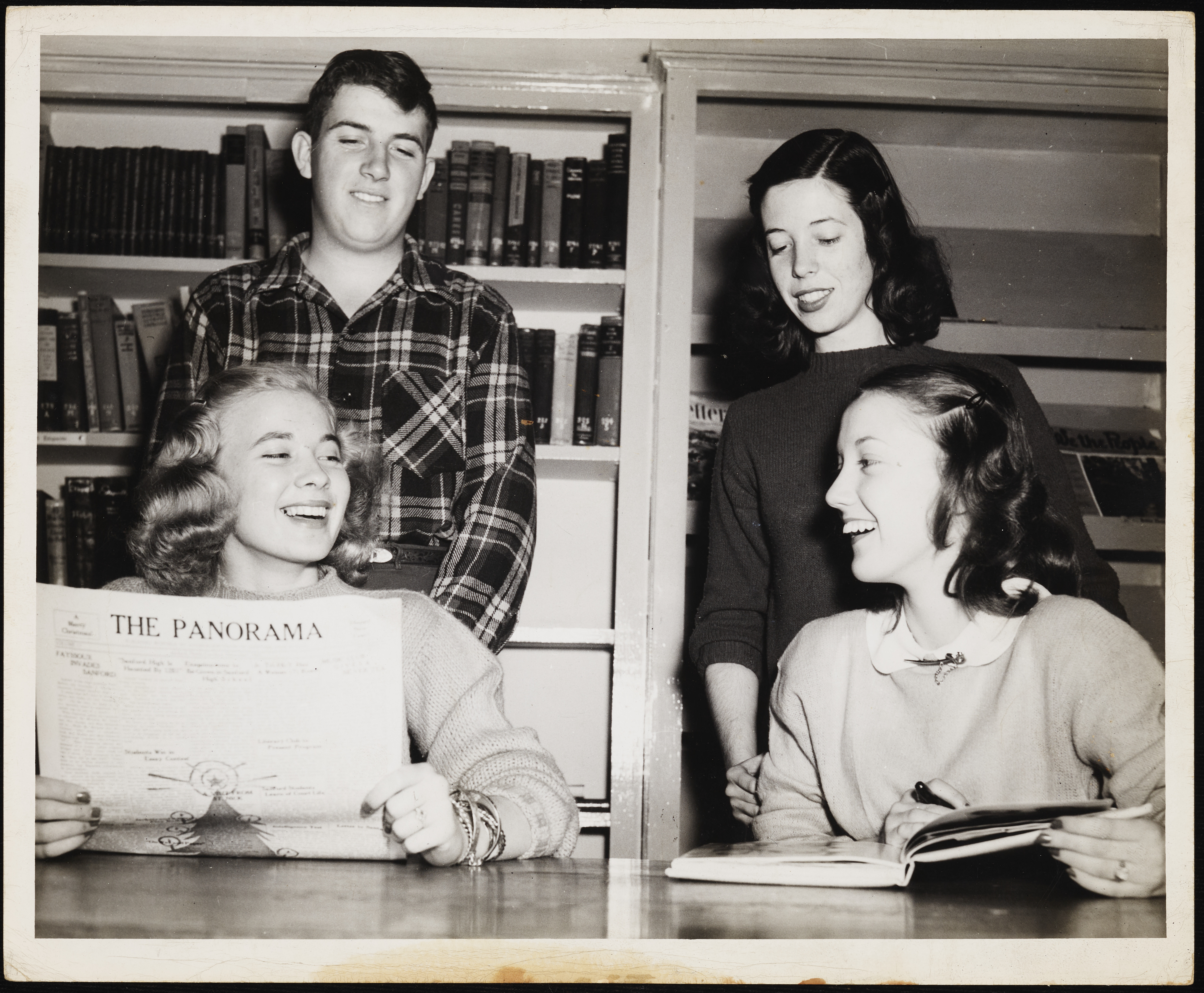 Sanford High School students check out The Panorama, the student newspaper, in the Sanford High School library. Image published in The Sanford Herald's April 3, 1947 issue.