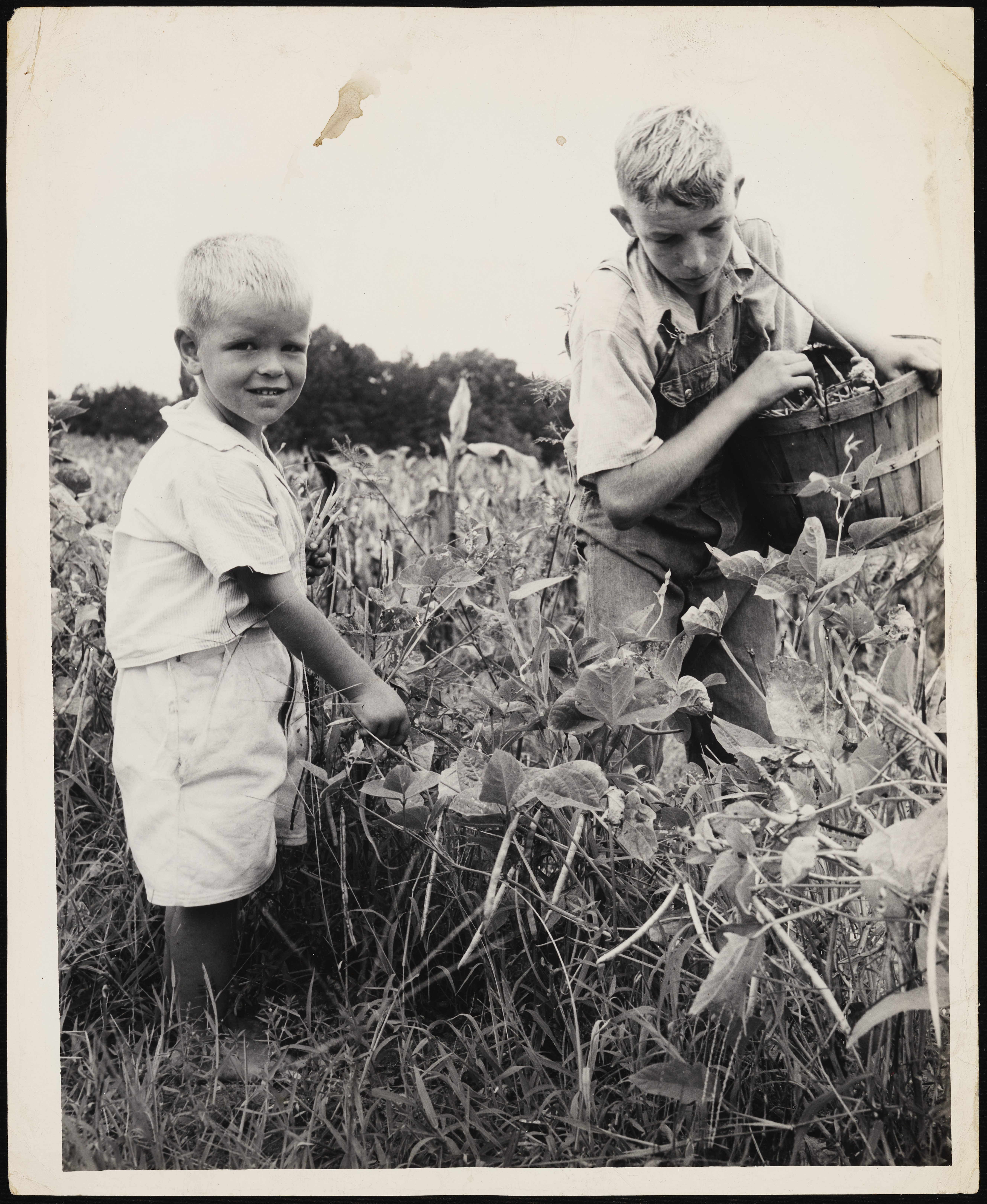 Billy Dowdy (age 3) and Jimmy Dowdy (age 14), sons of Raymond Dowdy (of Rt 1) picking peas. Appeared in the Farm Edition of The Sanford Herald on September 11, 1947 on page five.