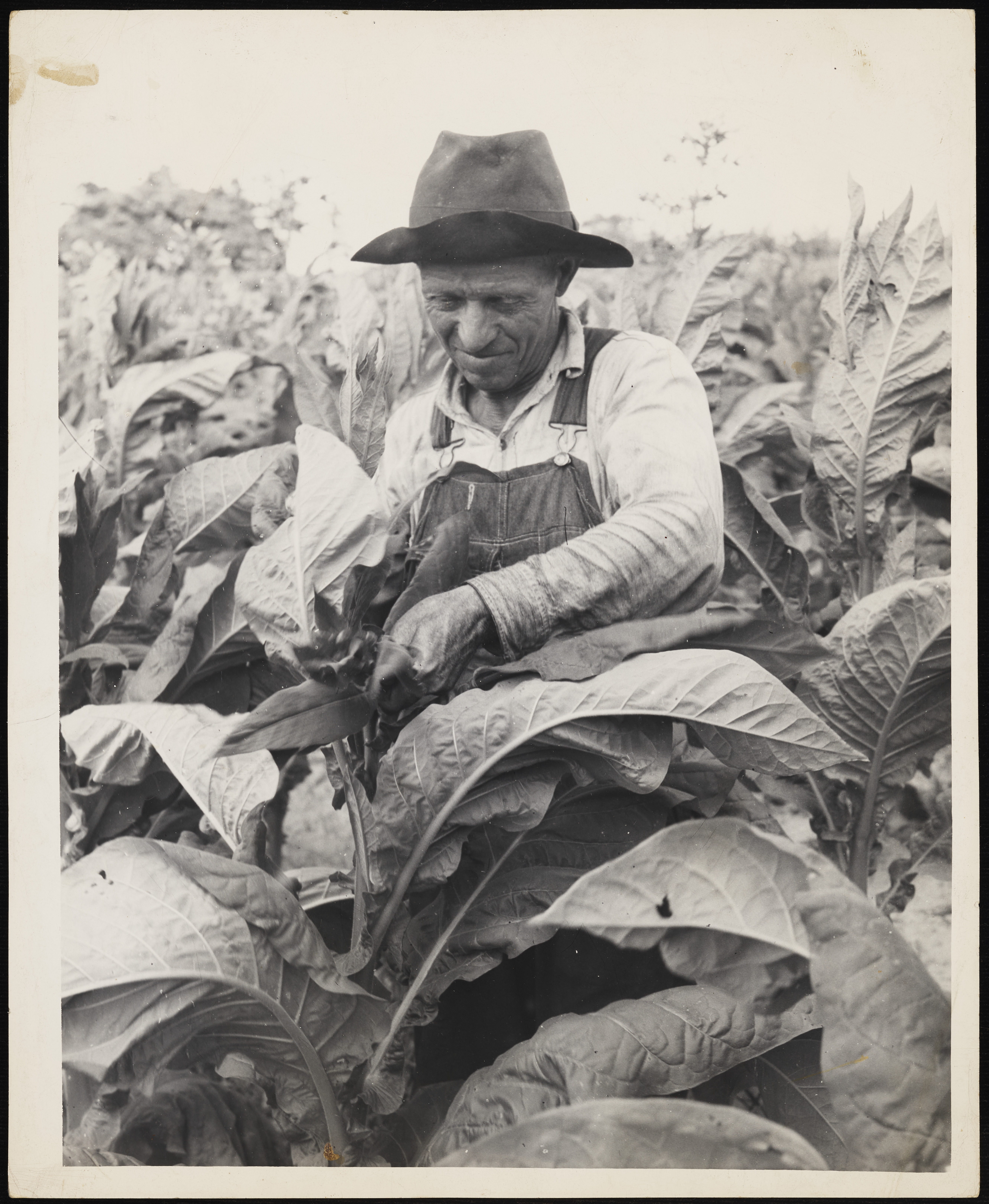 H.R. Carter, of Rt. 1 Sanford, removes suckers from his tobacco. Appeared in the Farm Edition of The Sanford Herald on September 11, 1947 on page five.