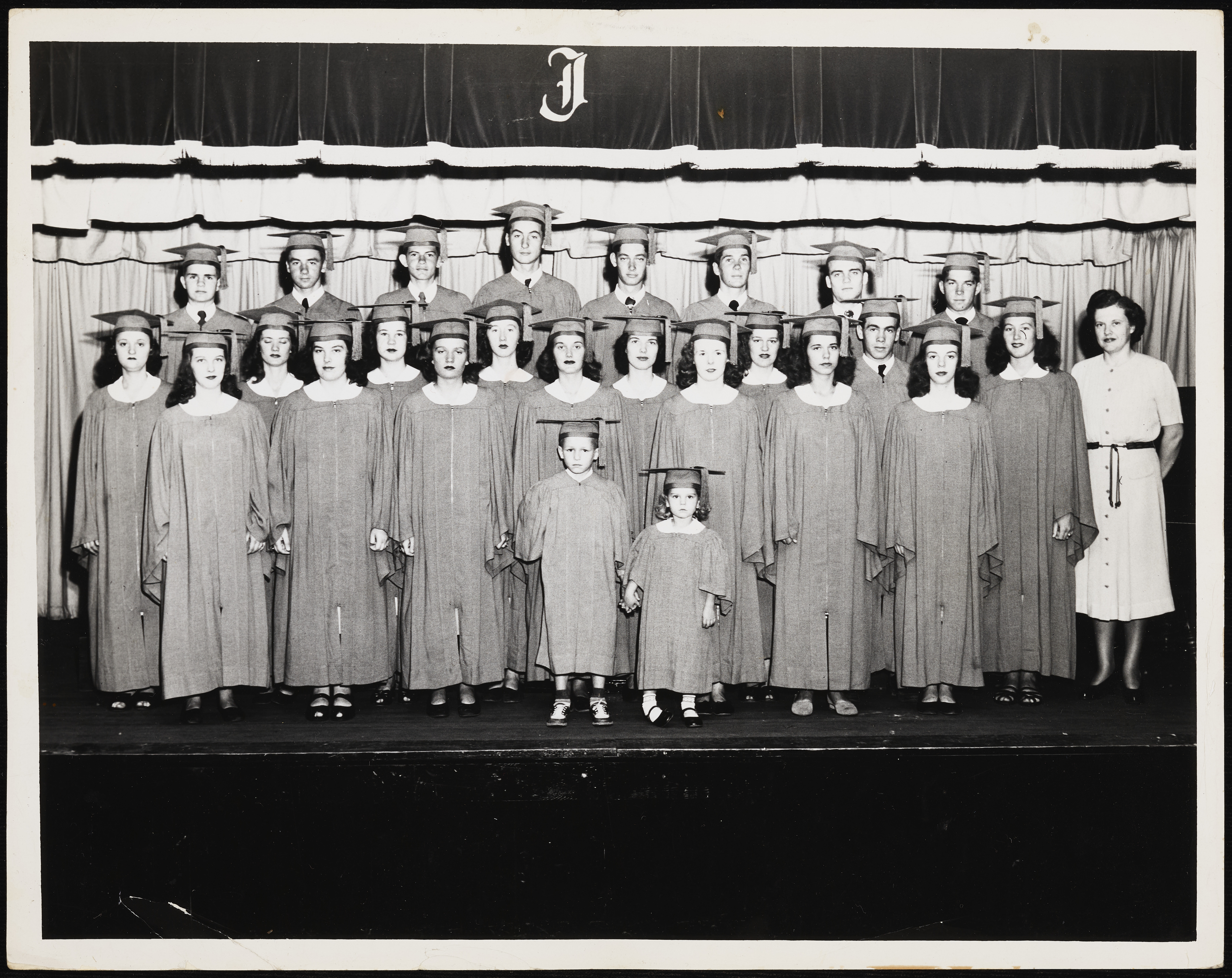 Jonesboro High School students in graduation regalia posing for a picture on a stage. Image published in The Sanford Herald's May 27, 1948 issue on page one.