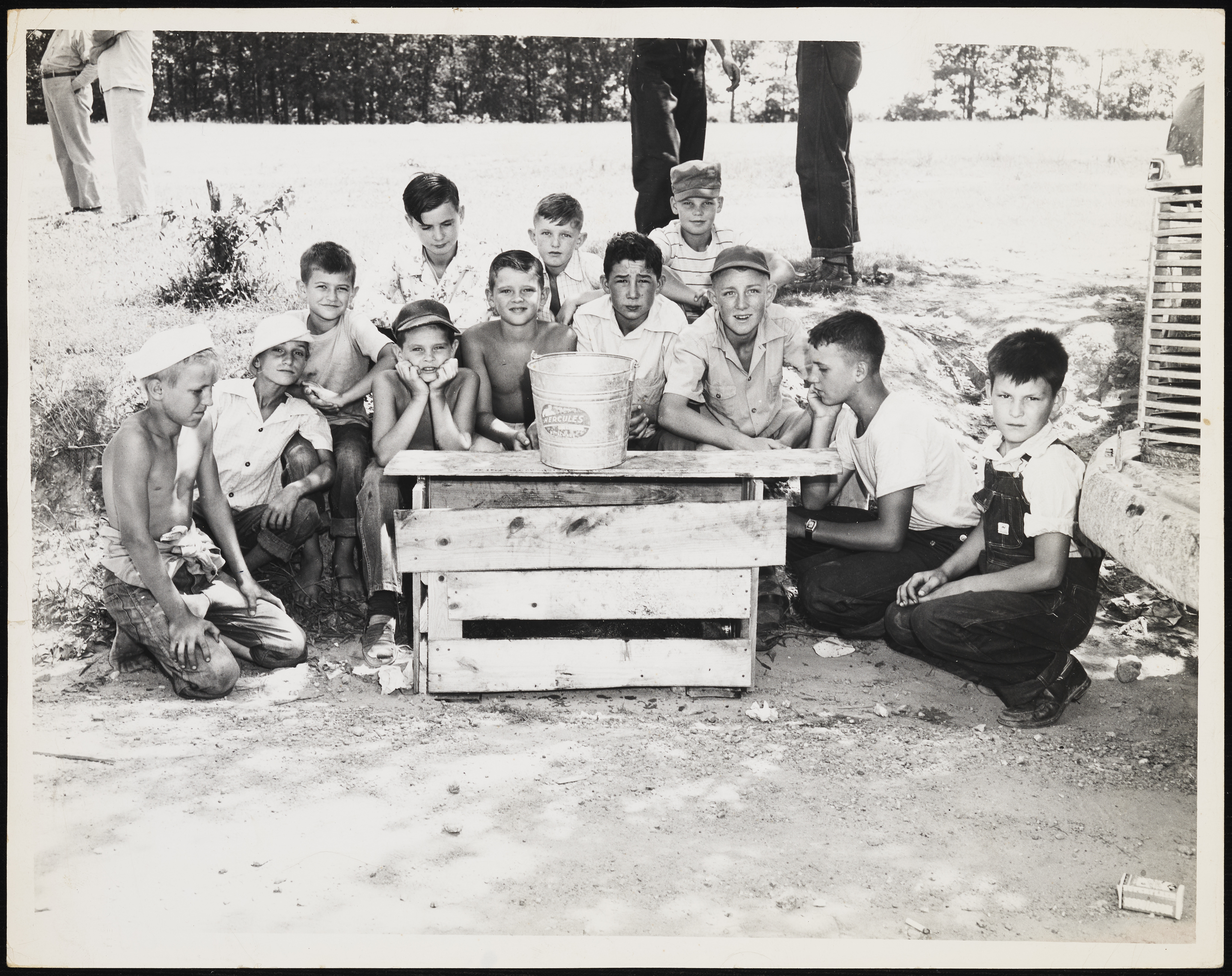Goldston boys posing behind a table that has a Hercules pail on top of it. Image published in The Sanford Herald's July 12, 1948 issue on page one.
