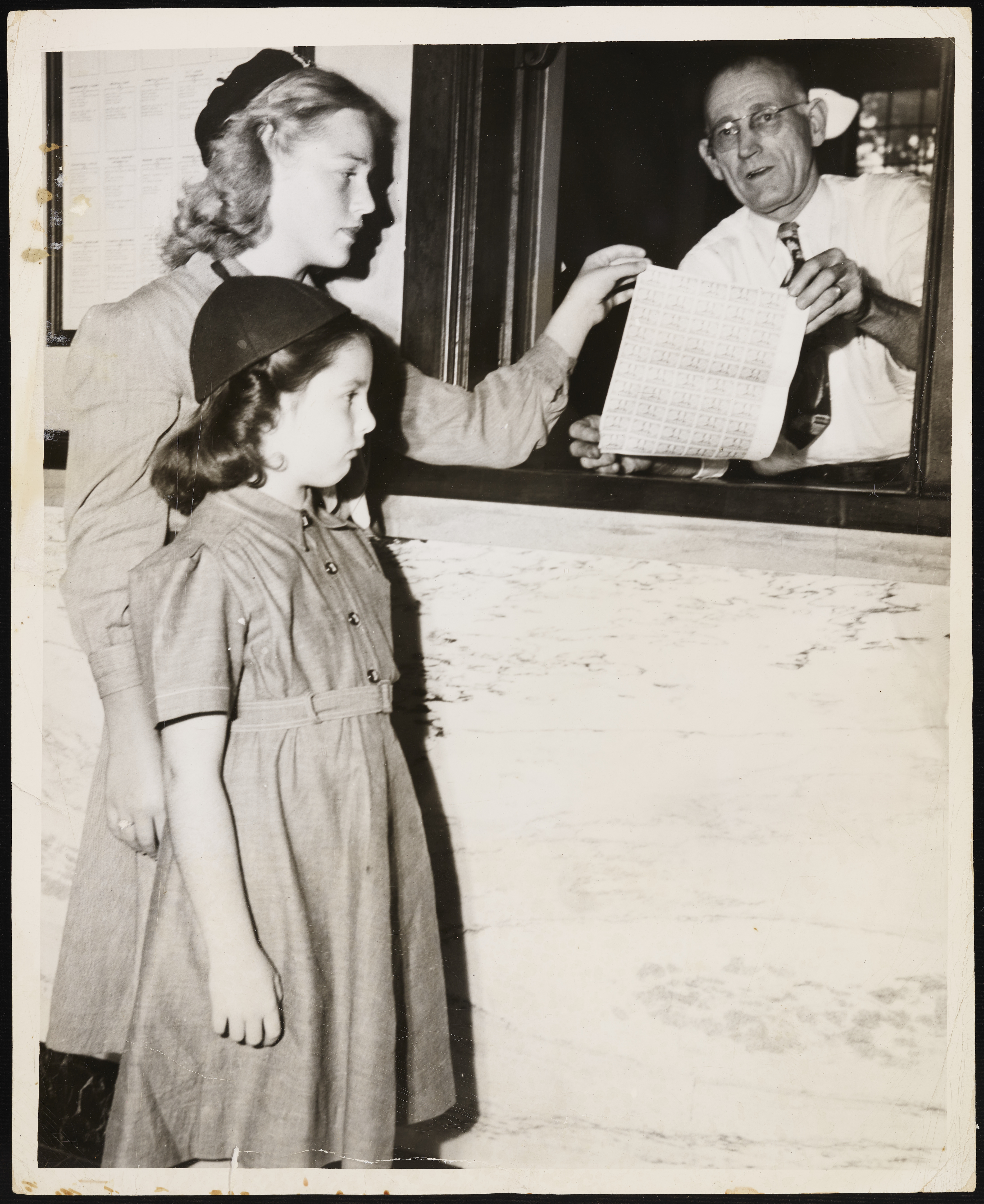 Two individuals, one dressed in a Girl Scouts dress, receiving a sheet of paper through a window. Image published in The Sanford Herald's November 8, 1948 issue on page one.