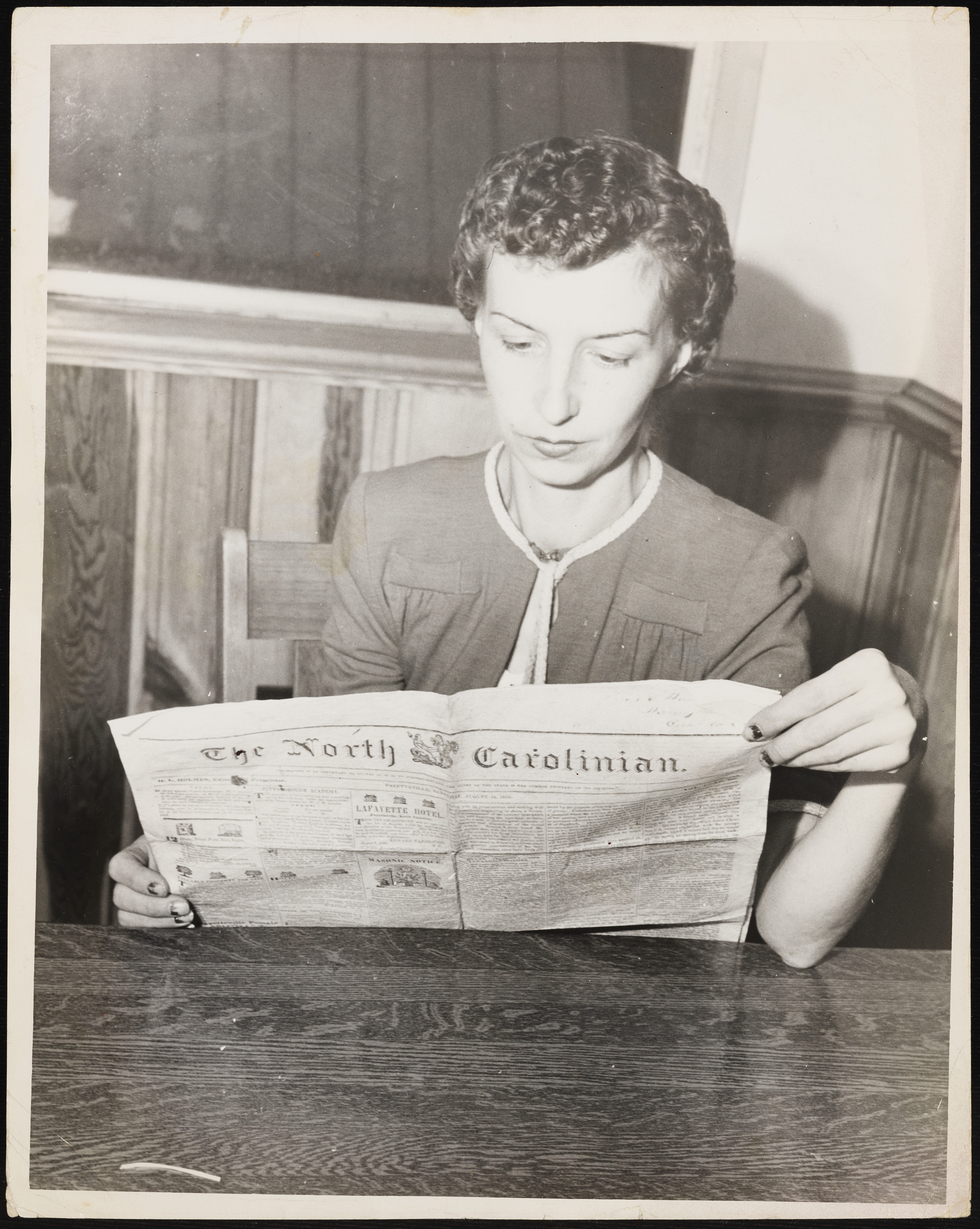 Adult seated at a table reading an issue of The North Carolinian. Image published in The Sanford Herald's December 13, 1948 issue on page five.