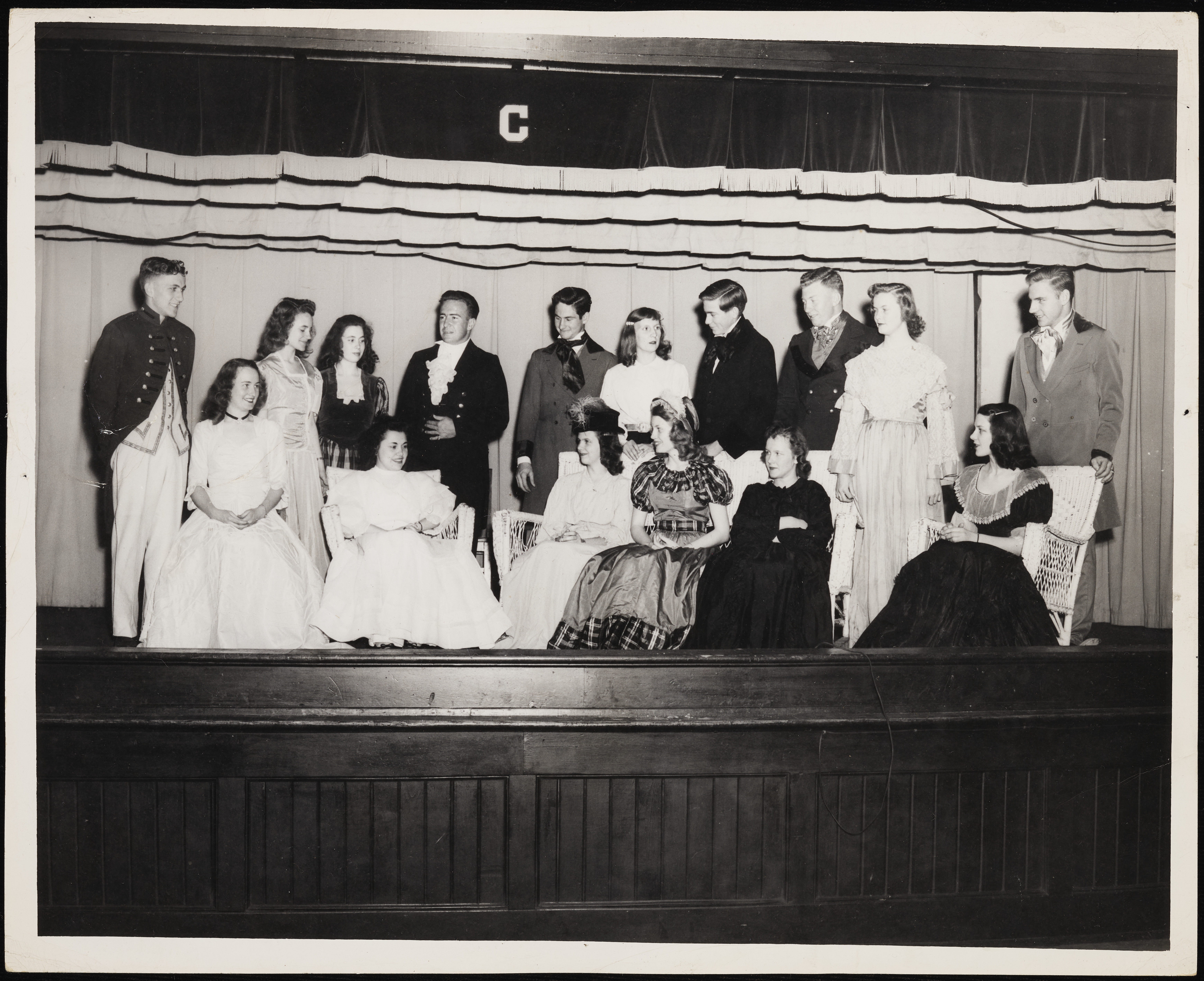 Costumed actors on a stage. Image published in The Sanford Herald's March 31, 1949 issue on page one.