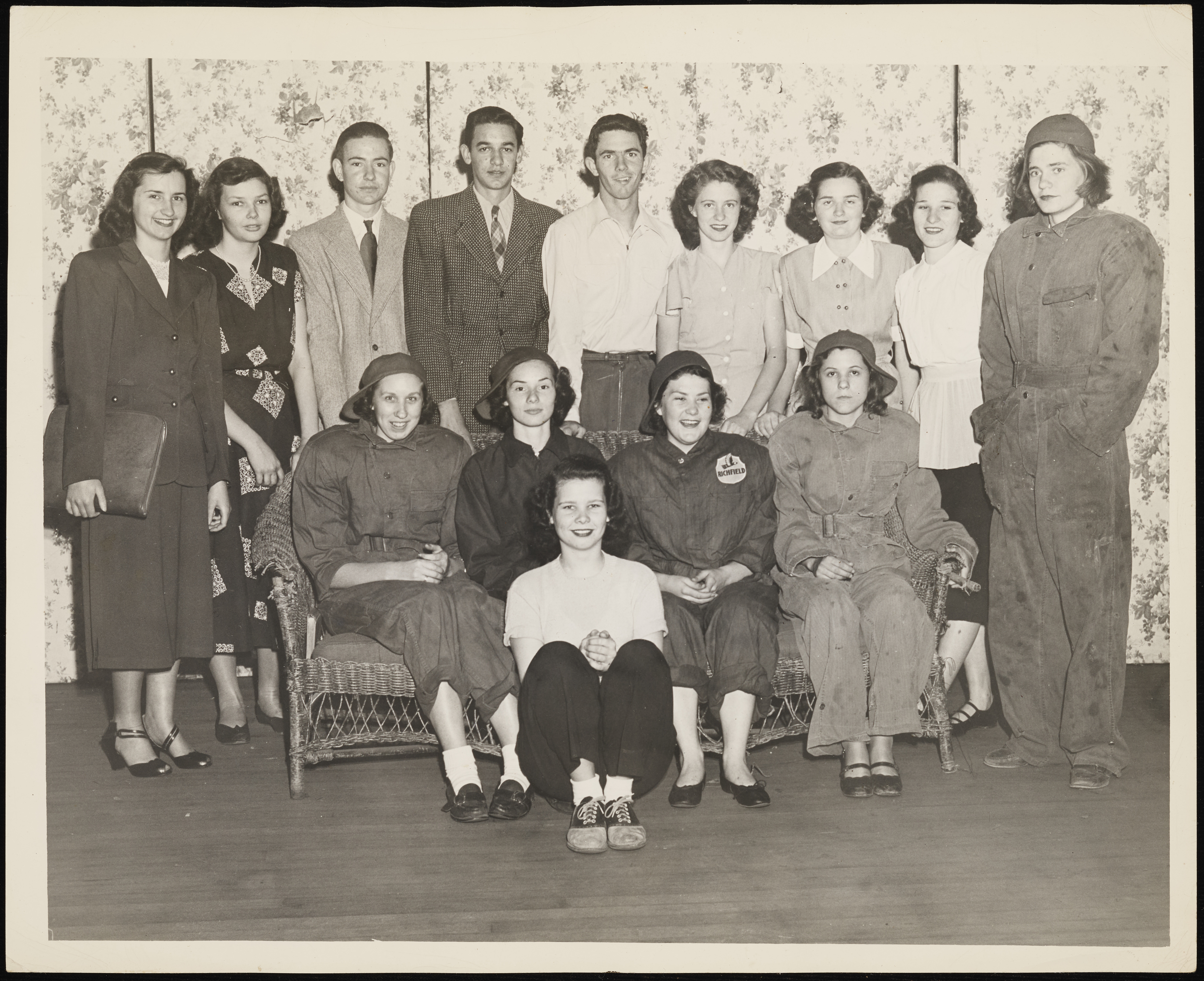 Costumed actors posing for a group portrait on a stage. Image published in The Sanford Herald's May 5, 1949 issue on page one.