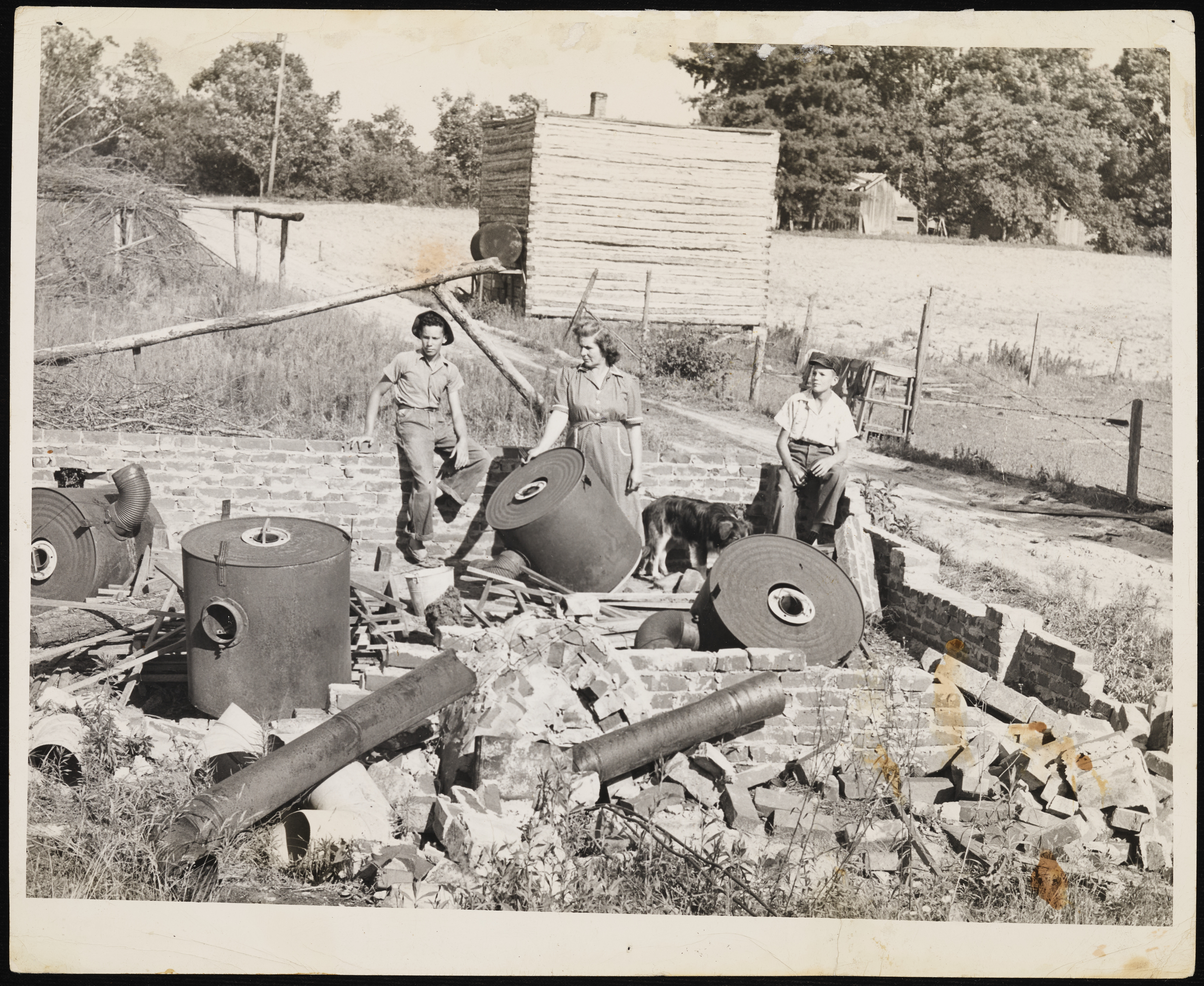 Three individuals and a dog surveying the remains of a building. Littered in front of them are metal cylinders, pipes, wood, and bricks. Transcription on the back of the photograph reads: "Castlebury." Image published in The Sanford Herald's May 30, 1949 issue on page one.