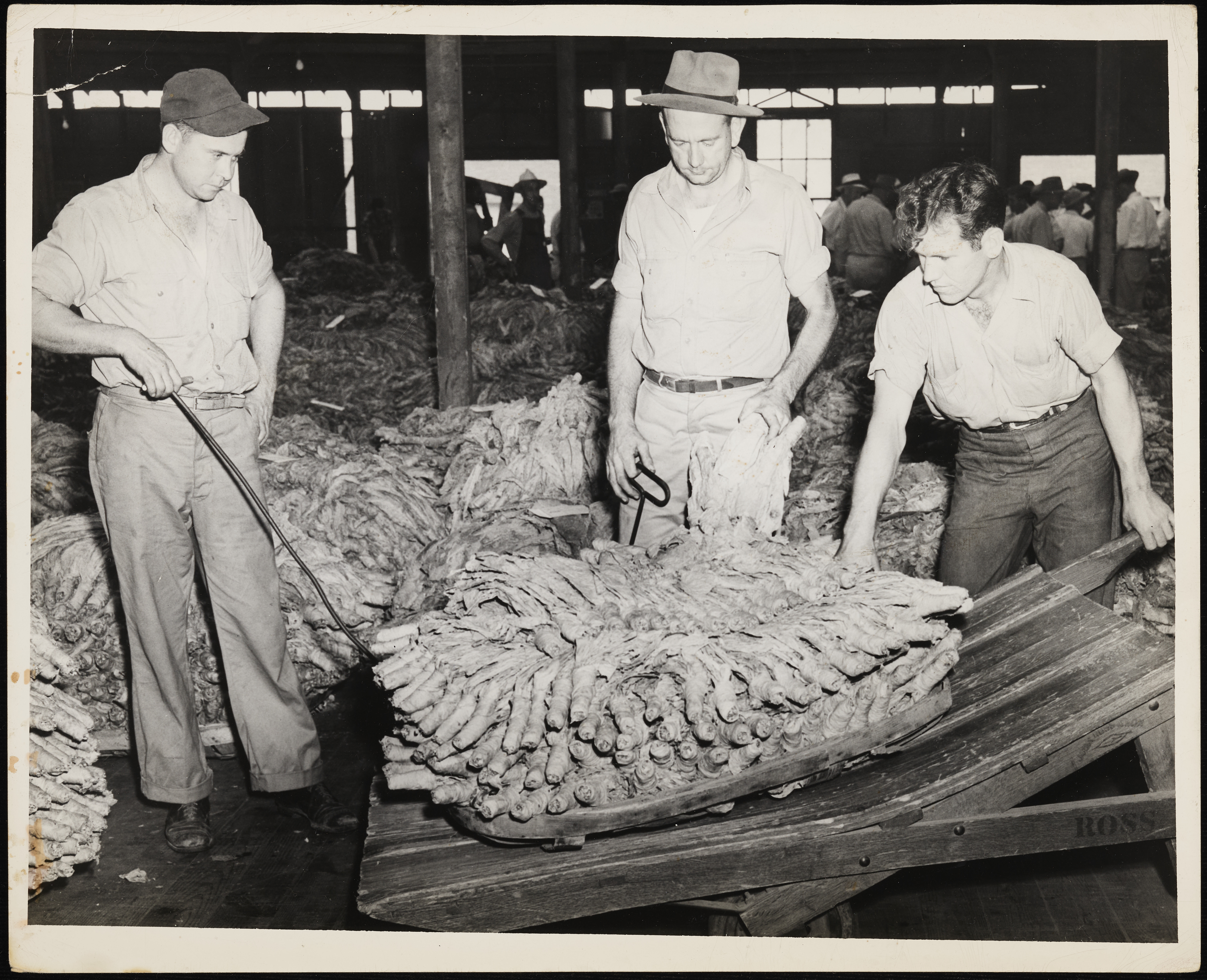 Transcription on the back of the photgraph reads: "Frank Foushee, Willard Cummings, and Claude Cummings. Putting [tobacco?] on floor in line to be auctioned." Image published in The Sanford Herald's September 12, 1949 issue on page one.
