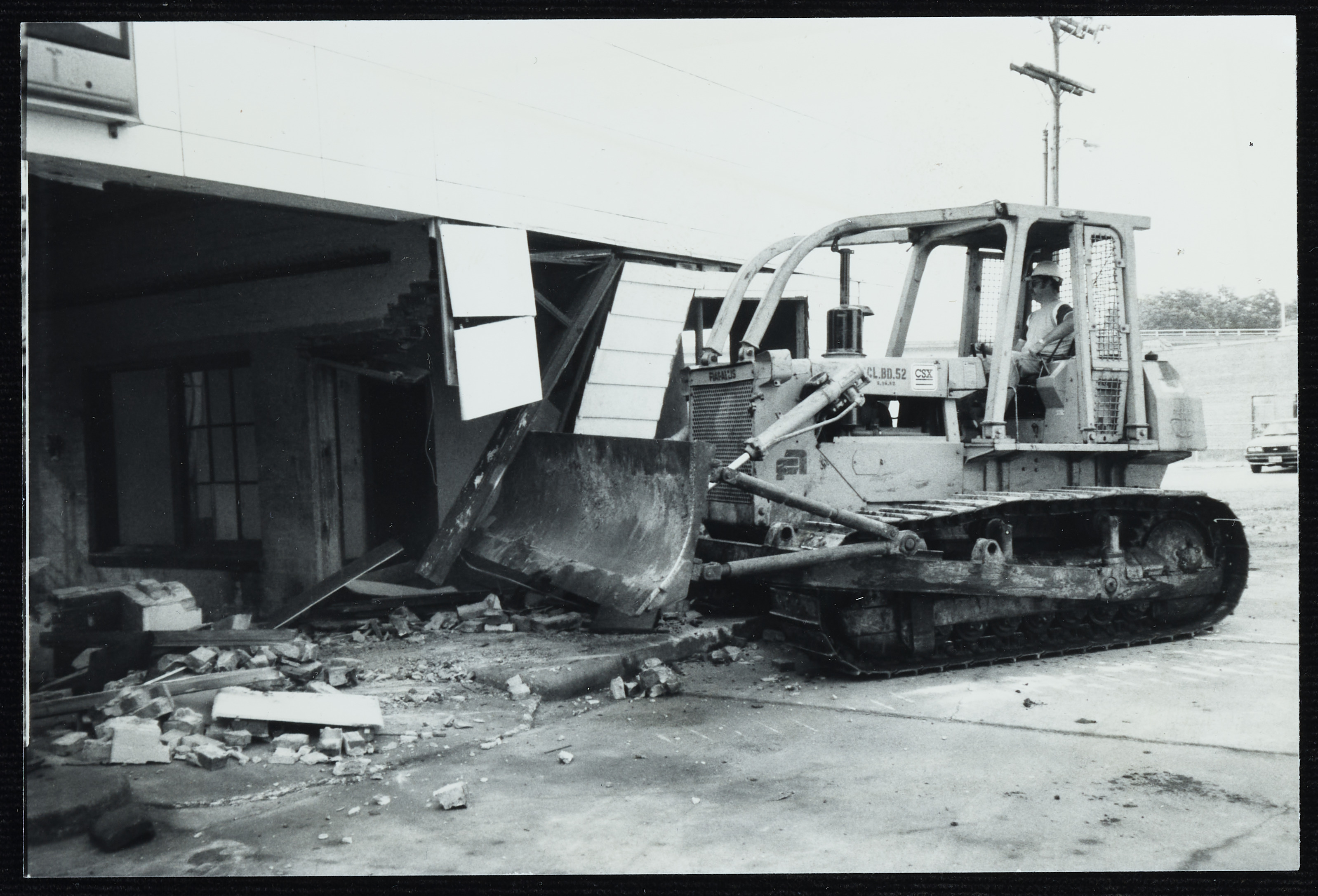 A bulldozer demolishes a building. A figure with a hardhat operates the vehicle.
