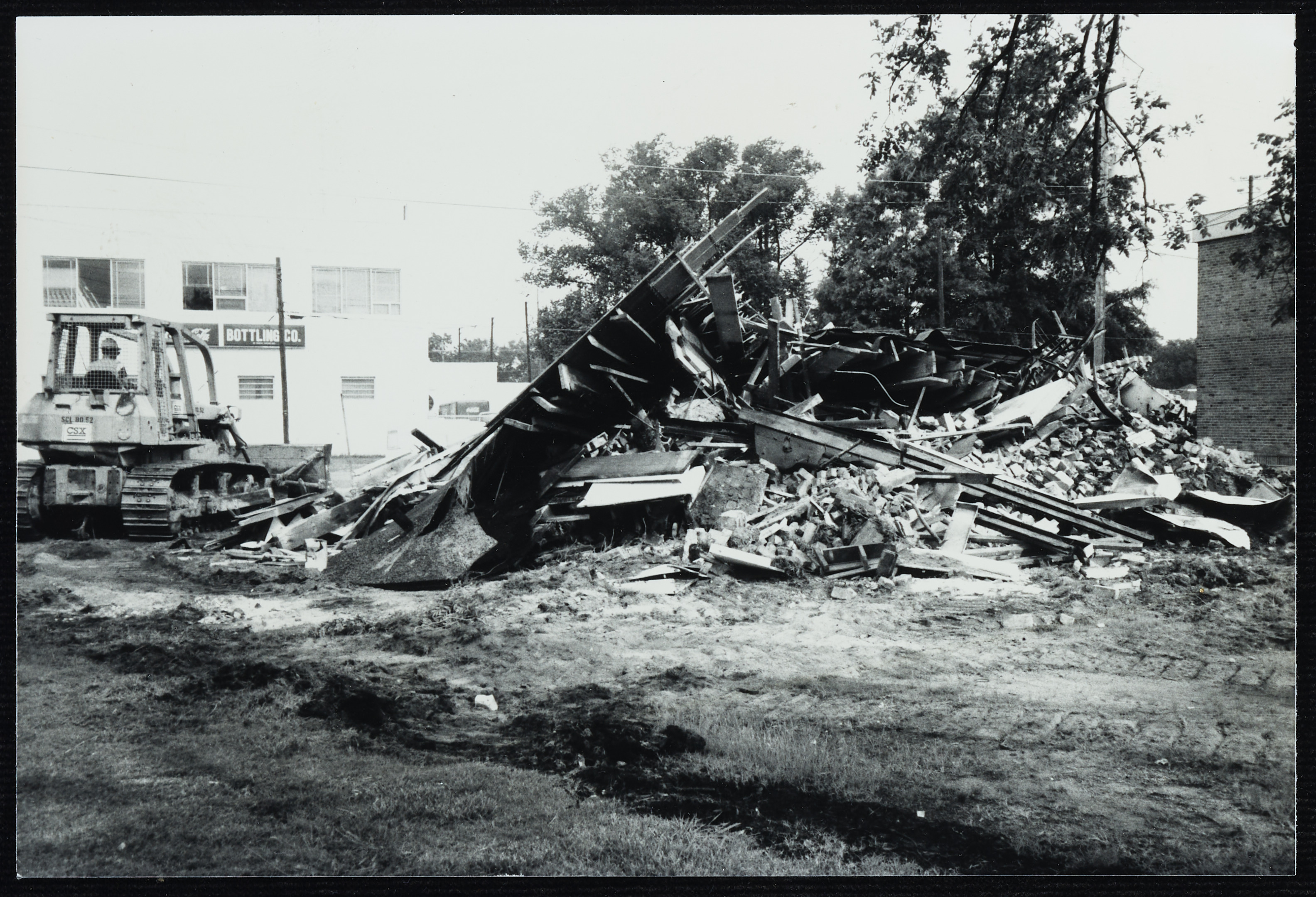 A bulldozer demolishes a building. A figure with a hardhat operates the vehicle.
