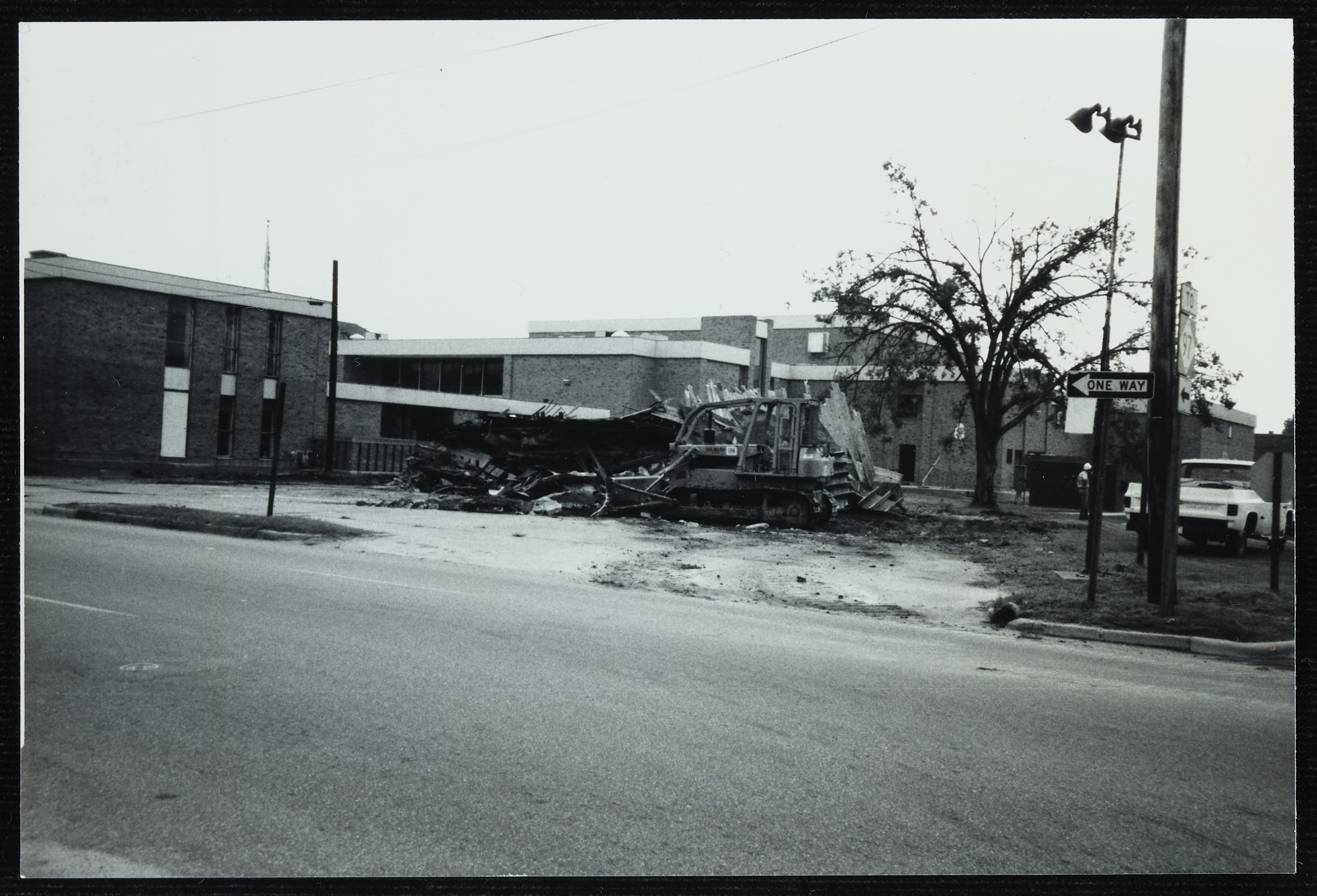 A bulldozer demolishes a building. The picture was taken across the street from the demolition.
