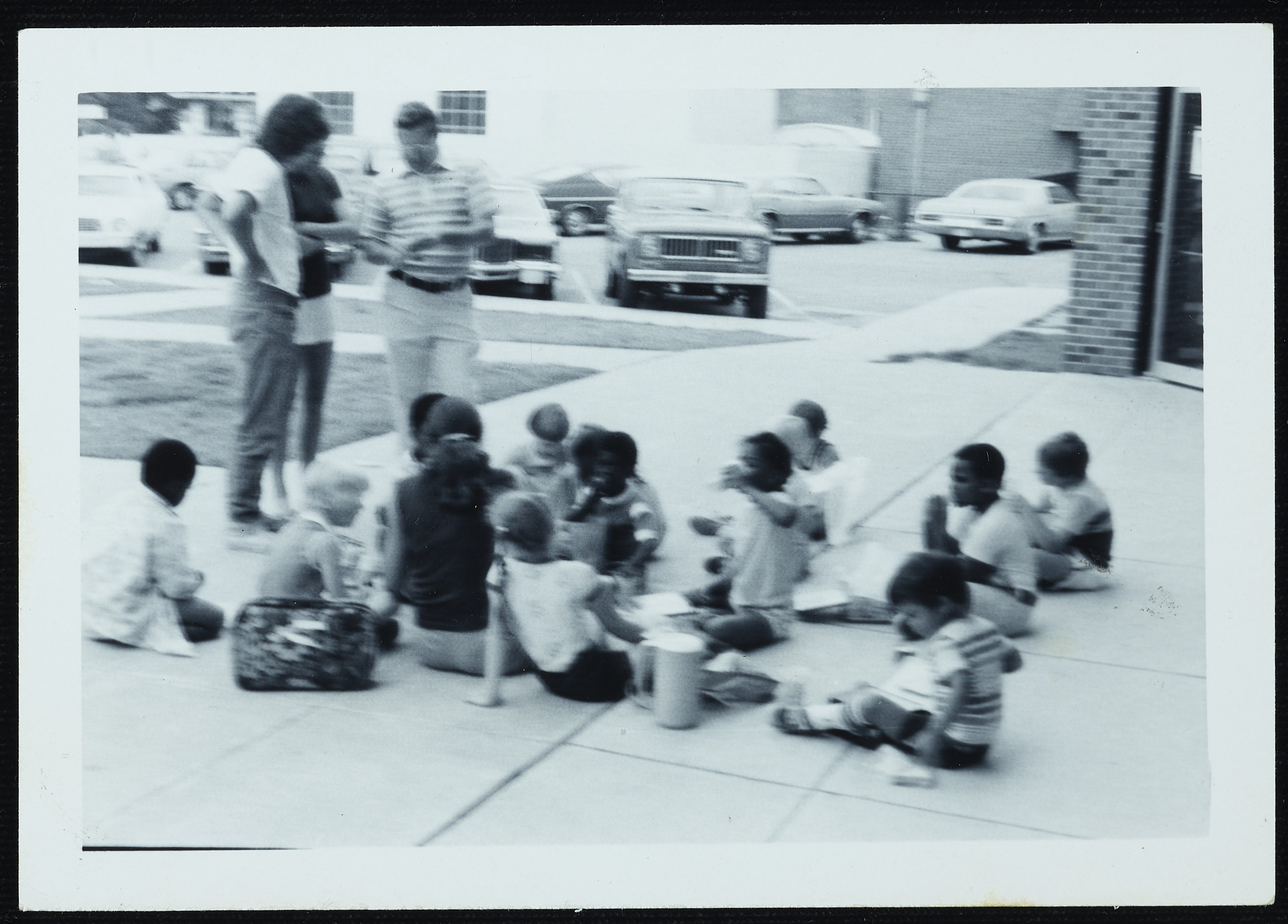 A group of children sit on a sidewalk. Several adults stand in the background.