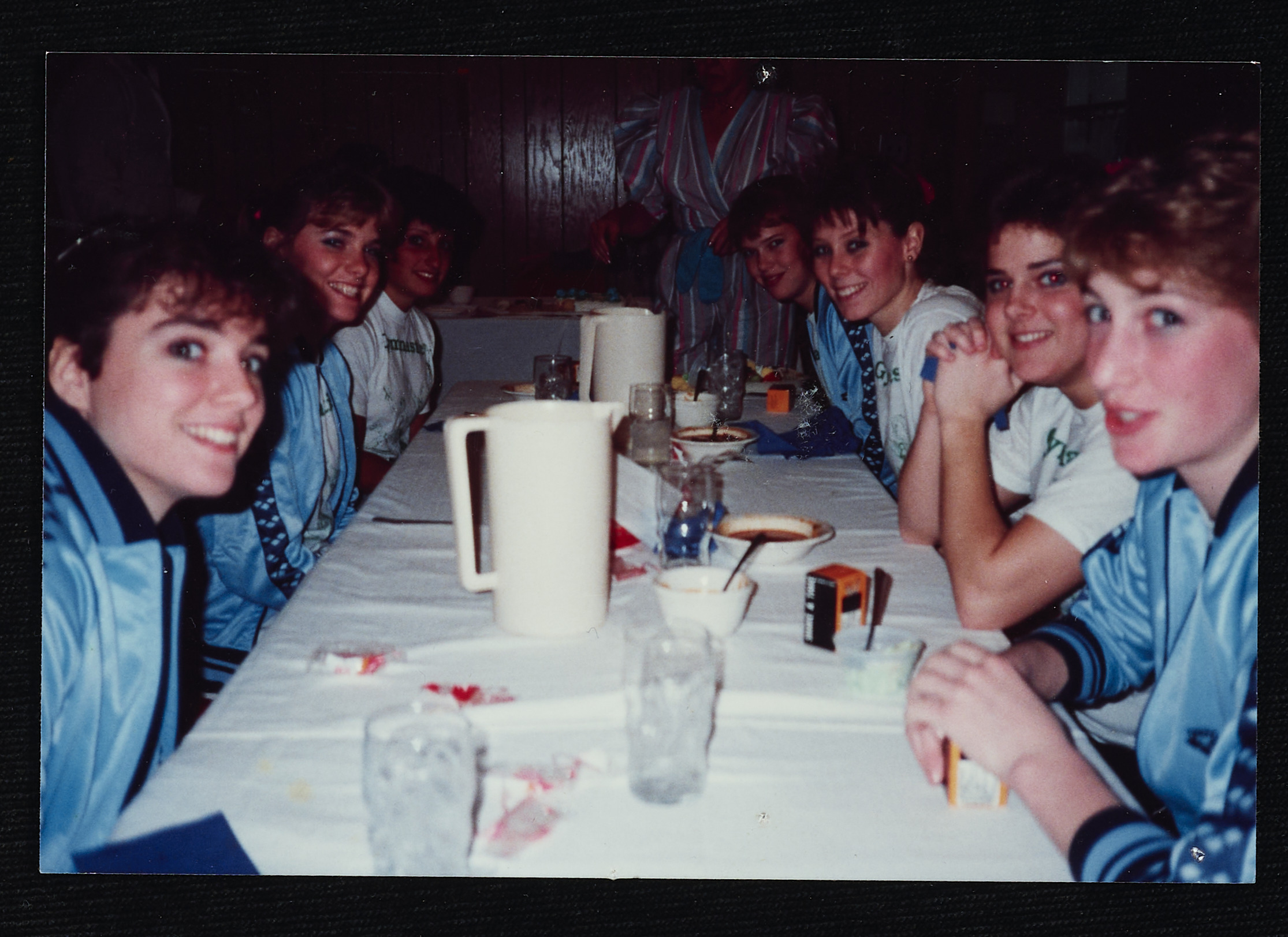 Figures (possibly student athletes) sit at a table and look into the camera. Many of the subjects are wearing matching blue and white jackets. The table holds pitchers, glasses, and rolls of film.