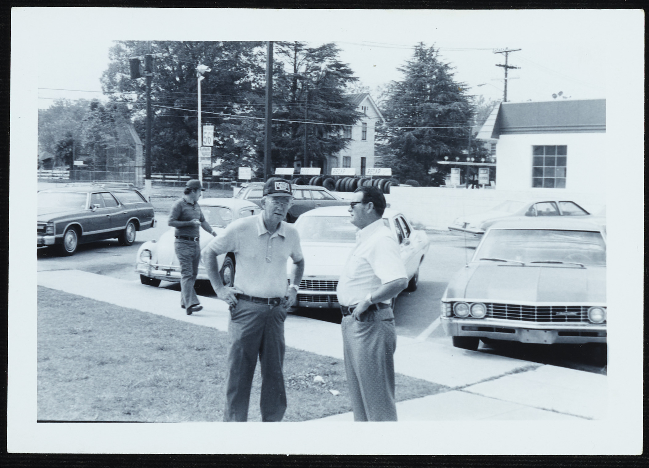 Two figures chat in front of a parking lot. A tire store can be seen in the background.