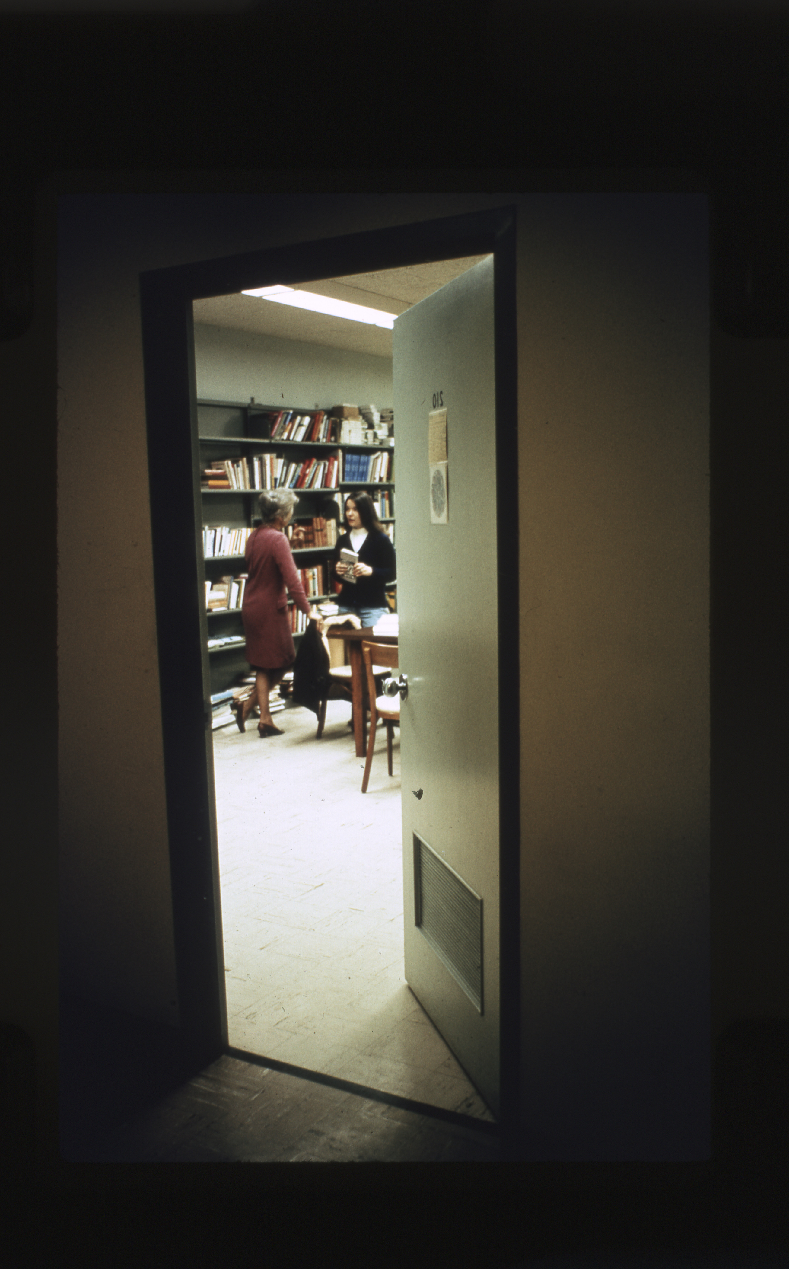 Two individuals talk to each other in the library of Queens College of Charlotte. One figure is younger and presumably a student, while the other is older and presumably a faculty member.