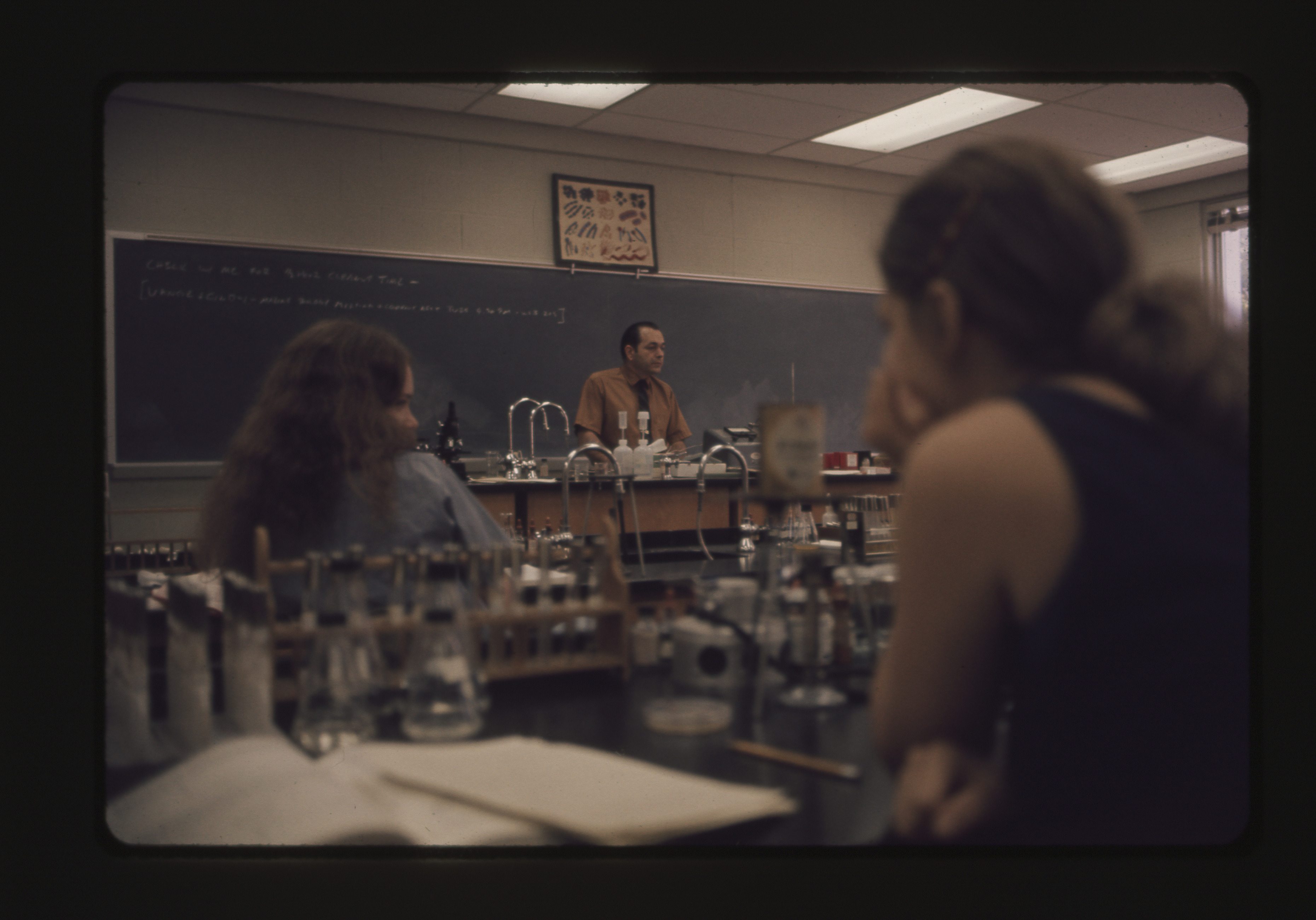 Students attending a lab class at Queens College of Charlotte. A teacher is pictured in the background.