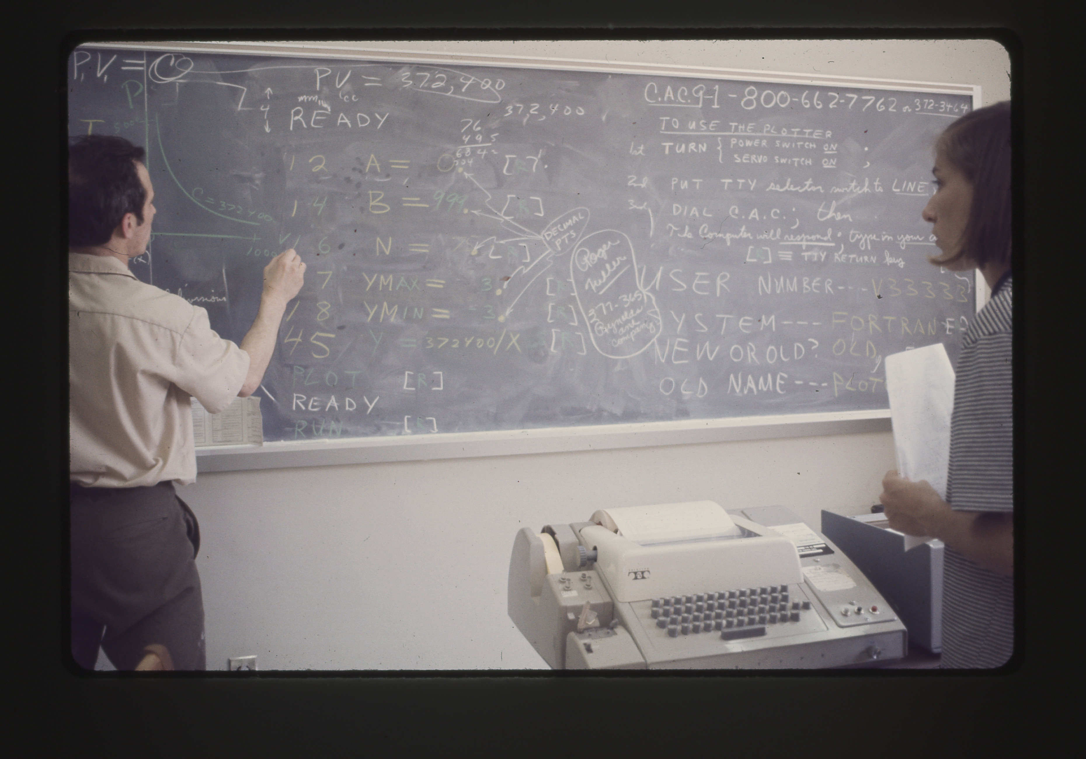 A faculty member writes on a blackboard. A fax machine and a student are seen behind him.