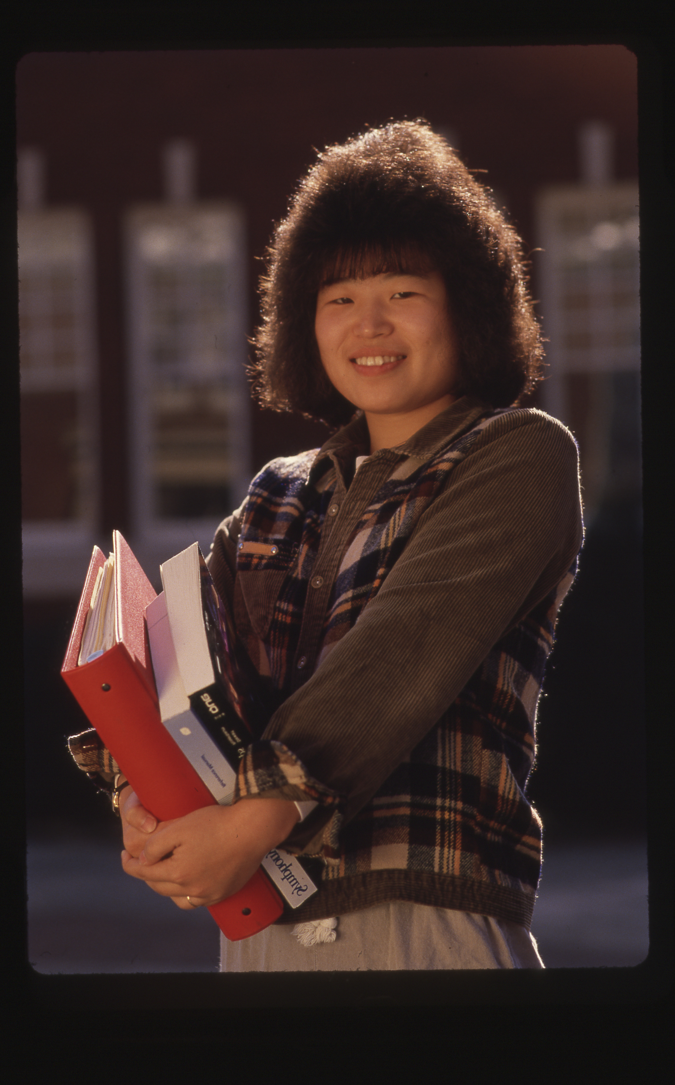 A student at Queens University holds a stack of books and looking at the camera.