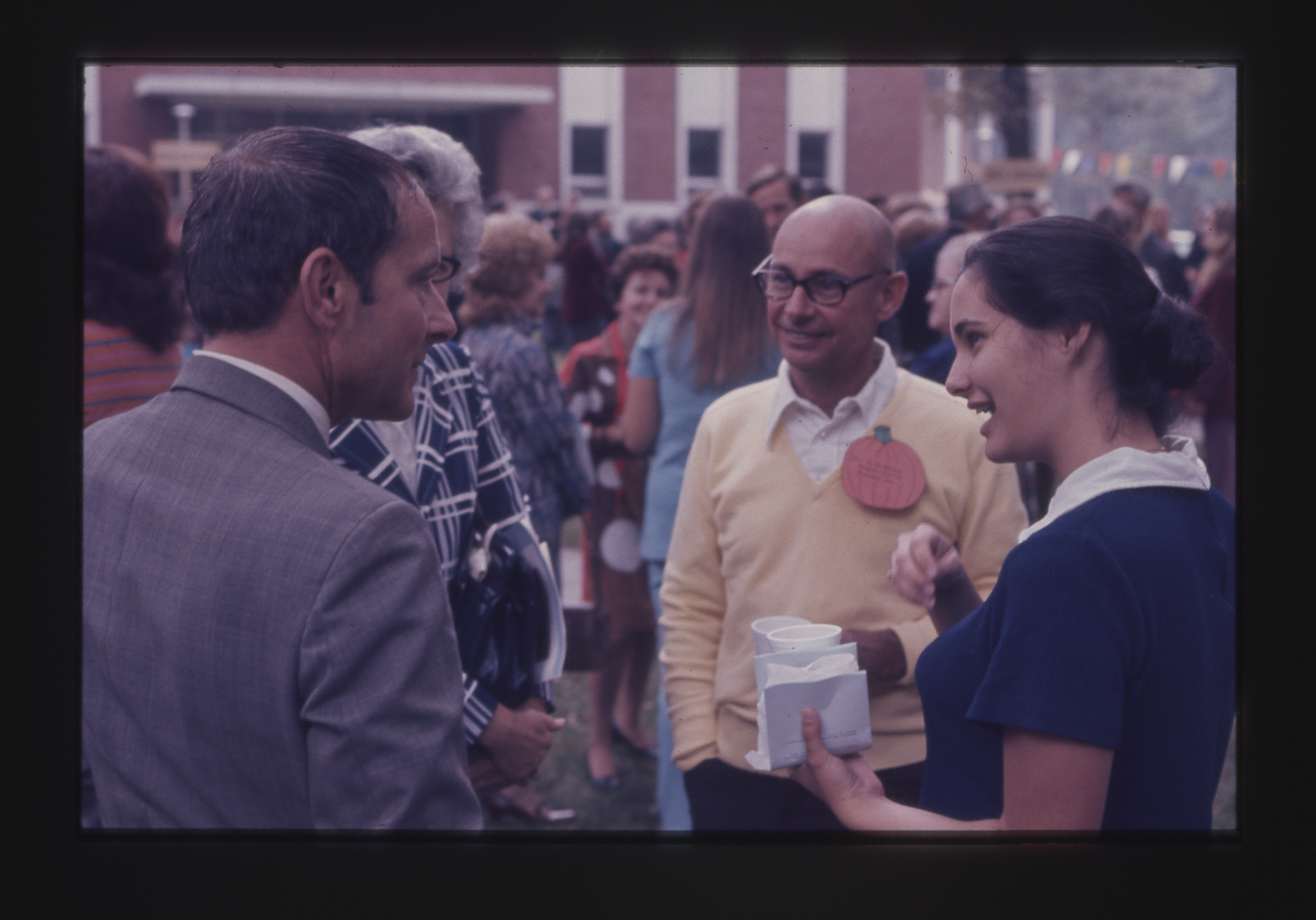 A group of students and faculty members attend a fair at Queens University of Charlotte. Booths, signs, and decorations can be seen.