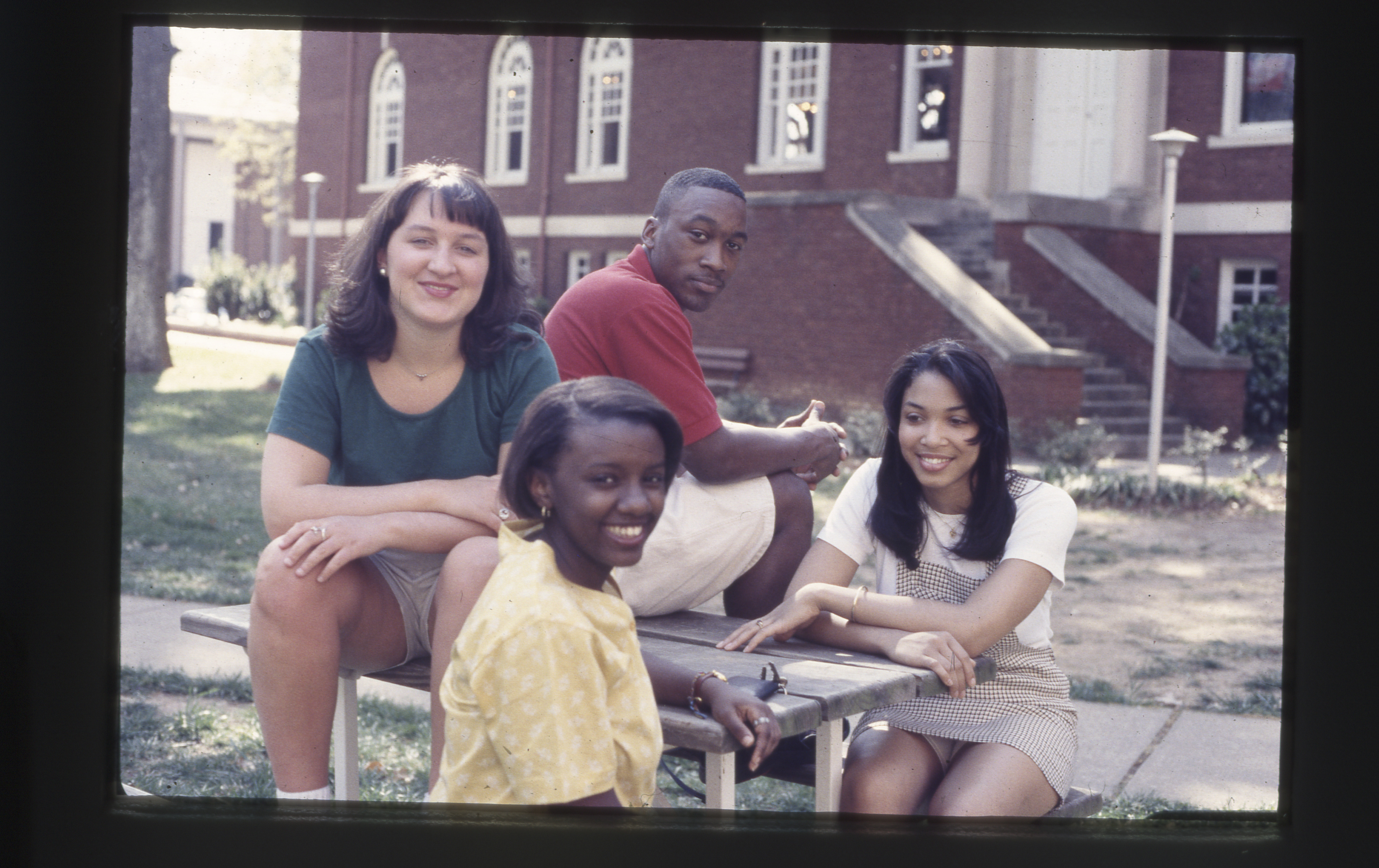 Four Queens College sit at and on a picnic table on campus.
