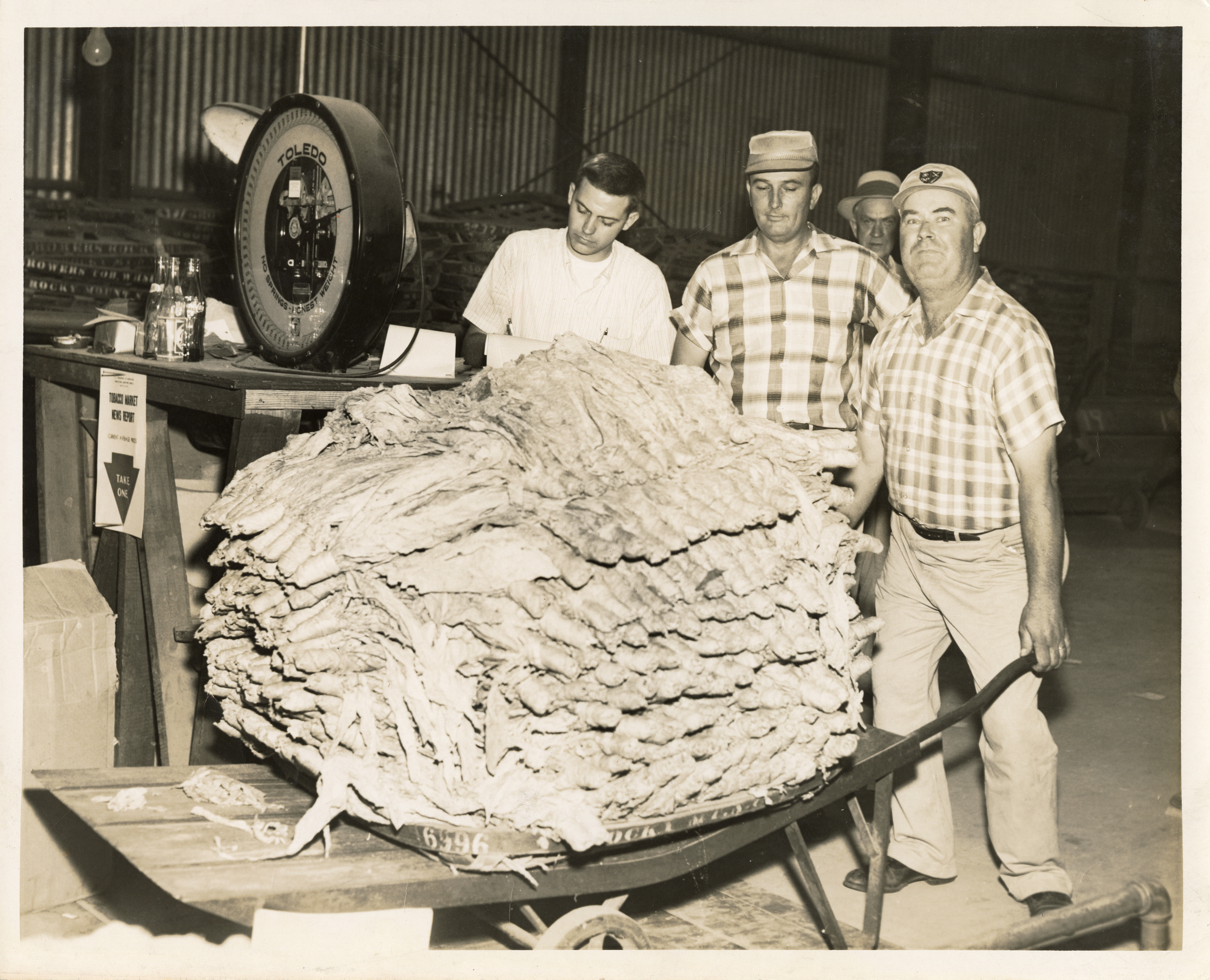 Tobacco farmers weighing their tobacco in a warehouse in Rocky Mount, NC