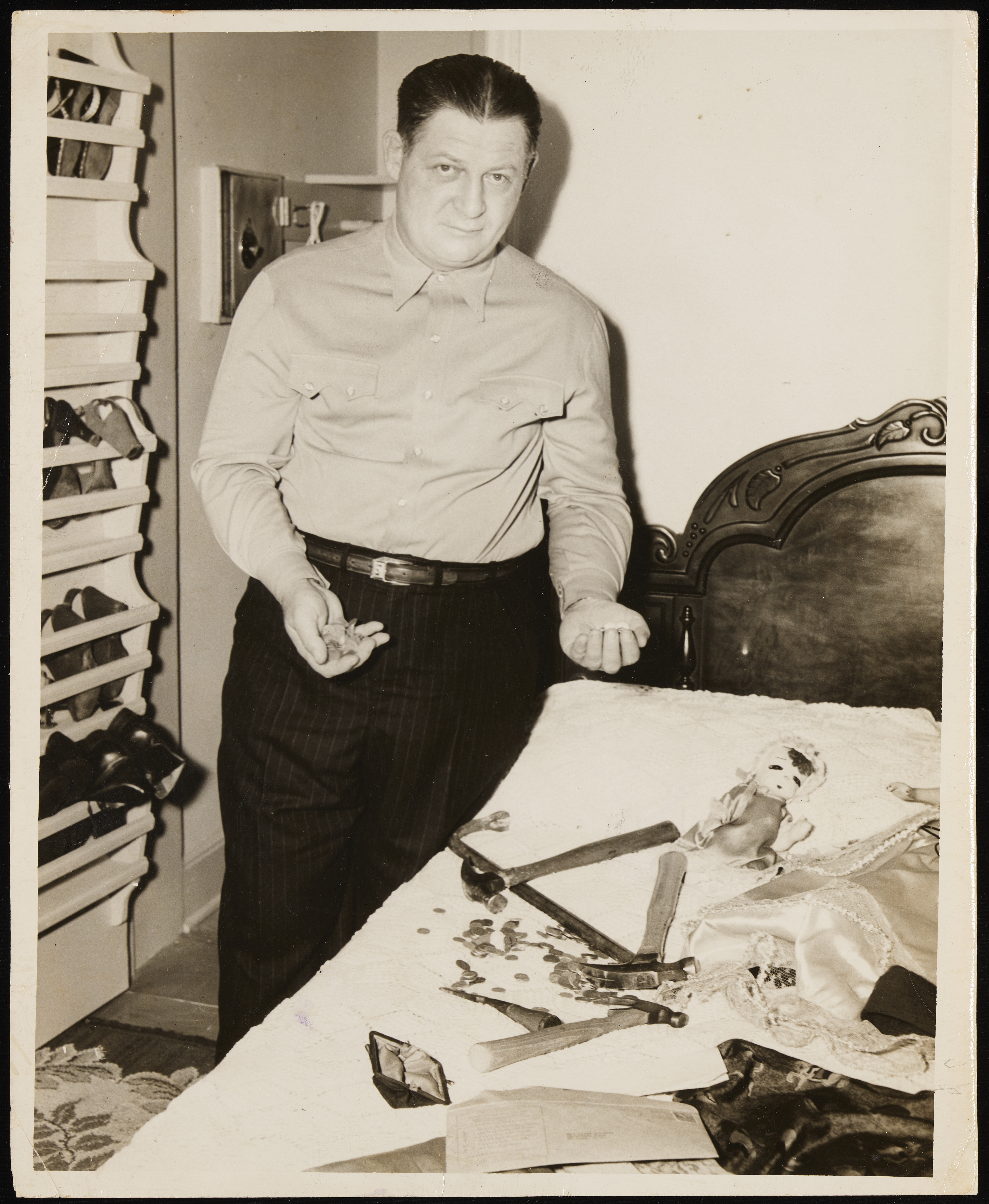 Unidentified adult at a potential robbery scene. Photograph taken by a Sanford Herald staff photographer. The image appeared in the January 16, 1950 issue of The Sanford Herald on page 1.