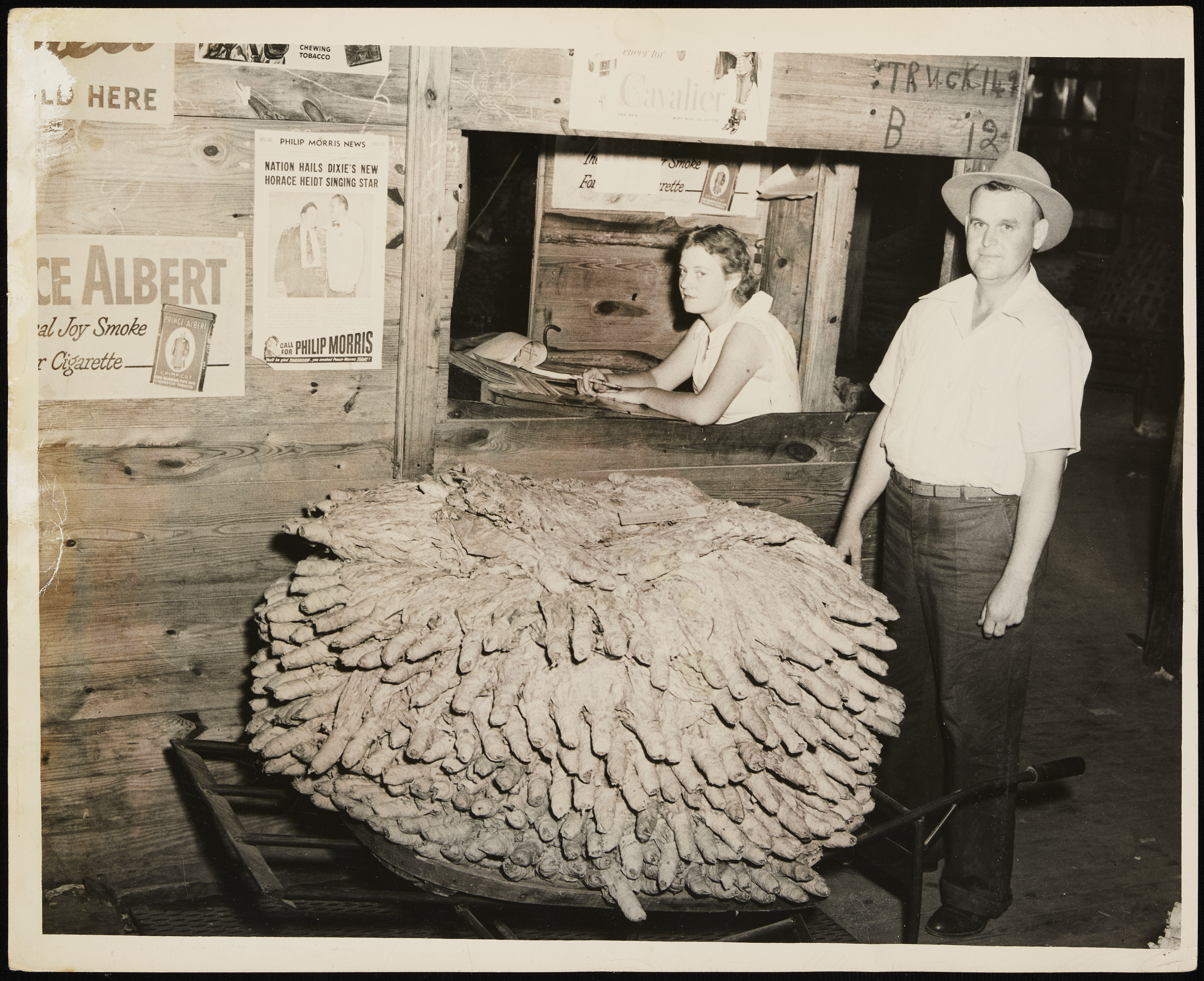Unidentified adult bringing a basket of tobacco to market, while another adult keeps a register. Photograph taken by a Sanford Herald staff photographer. The image appeared in the October 12, 1950 issue of The Sanford Herald on page 1, section 2.