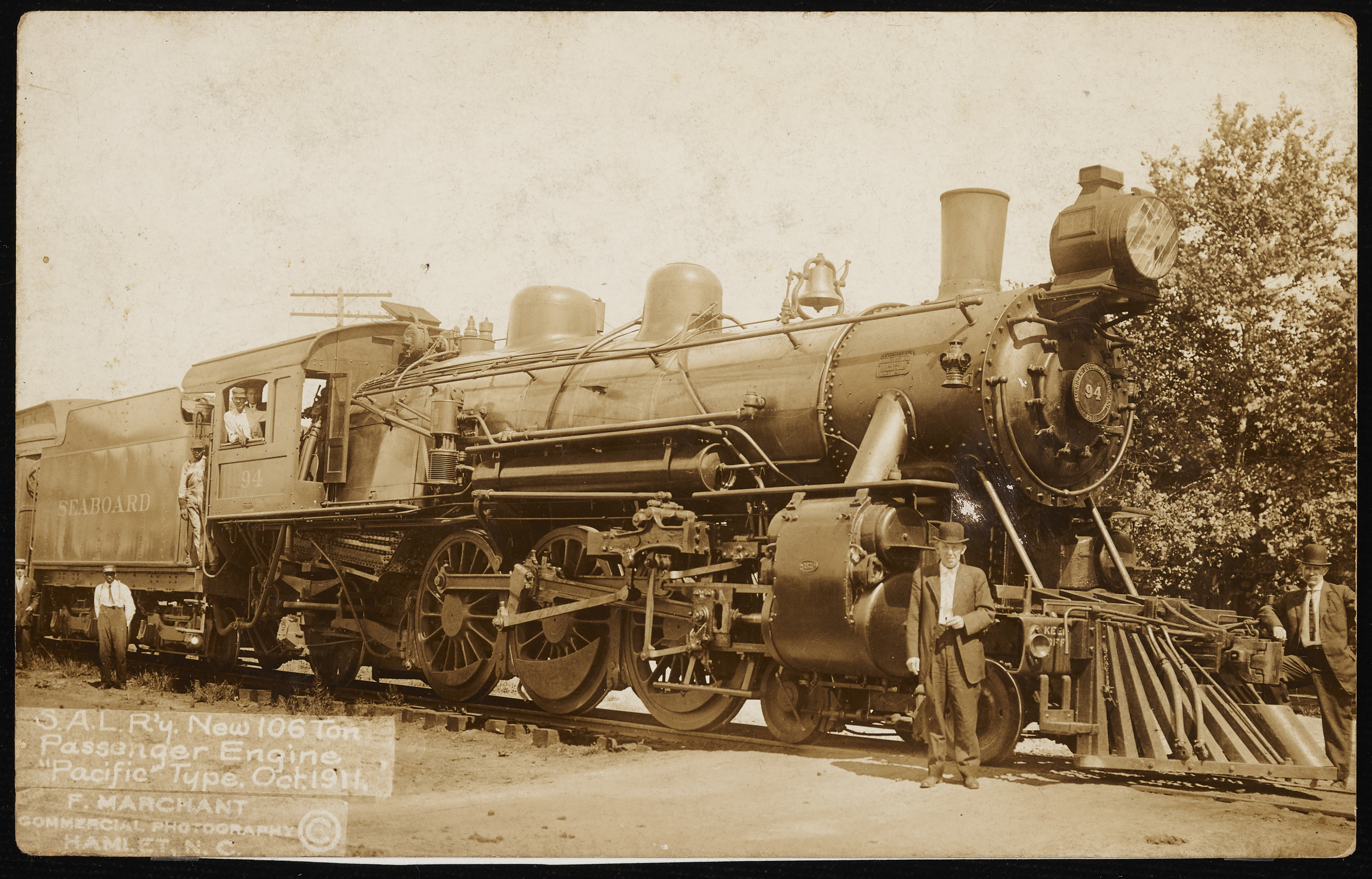 Seaboard Air Line Railways' new 106-ton "Pacific" type passenger engine in Hamlet, NC. Photograph taken by commercial photographer F. Marchant in October 1911.