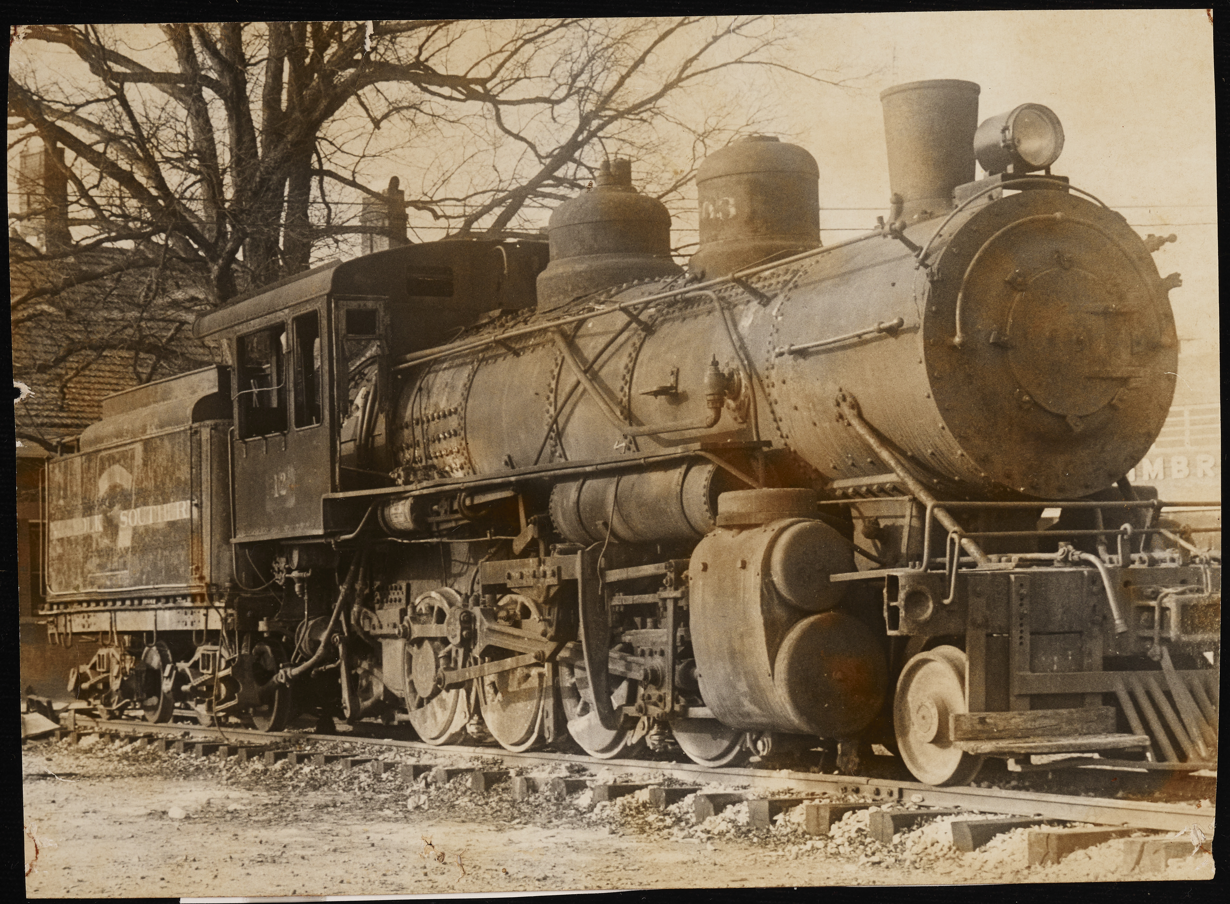 Atlantic and Western steam locomotive no. 12 right after it was moved and located at the Railroad House. The engine and tender were donated to the Railroad House Historical Assoc. by Mr. E. T. Ussery, President of A&W Railway Company, Sanford, NC.