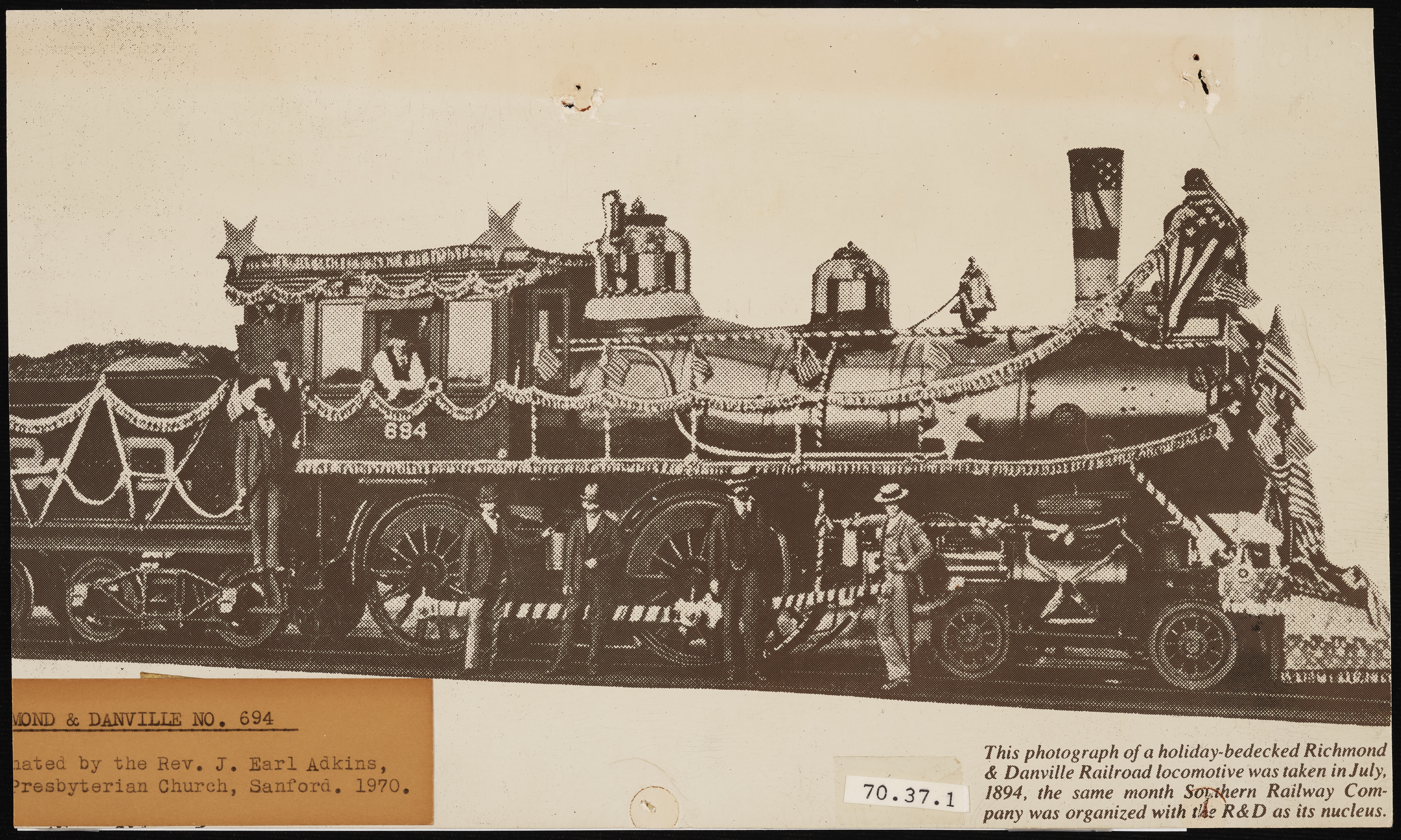 Photograph of the holiday-bedecked Richmond and Danville (R & D) Railroad locomotive taken July 1894, the same month the Southern Railway Company was organized with the R & D as its nucleus.