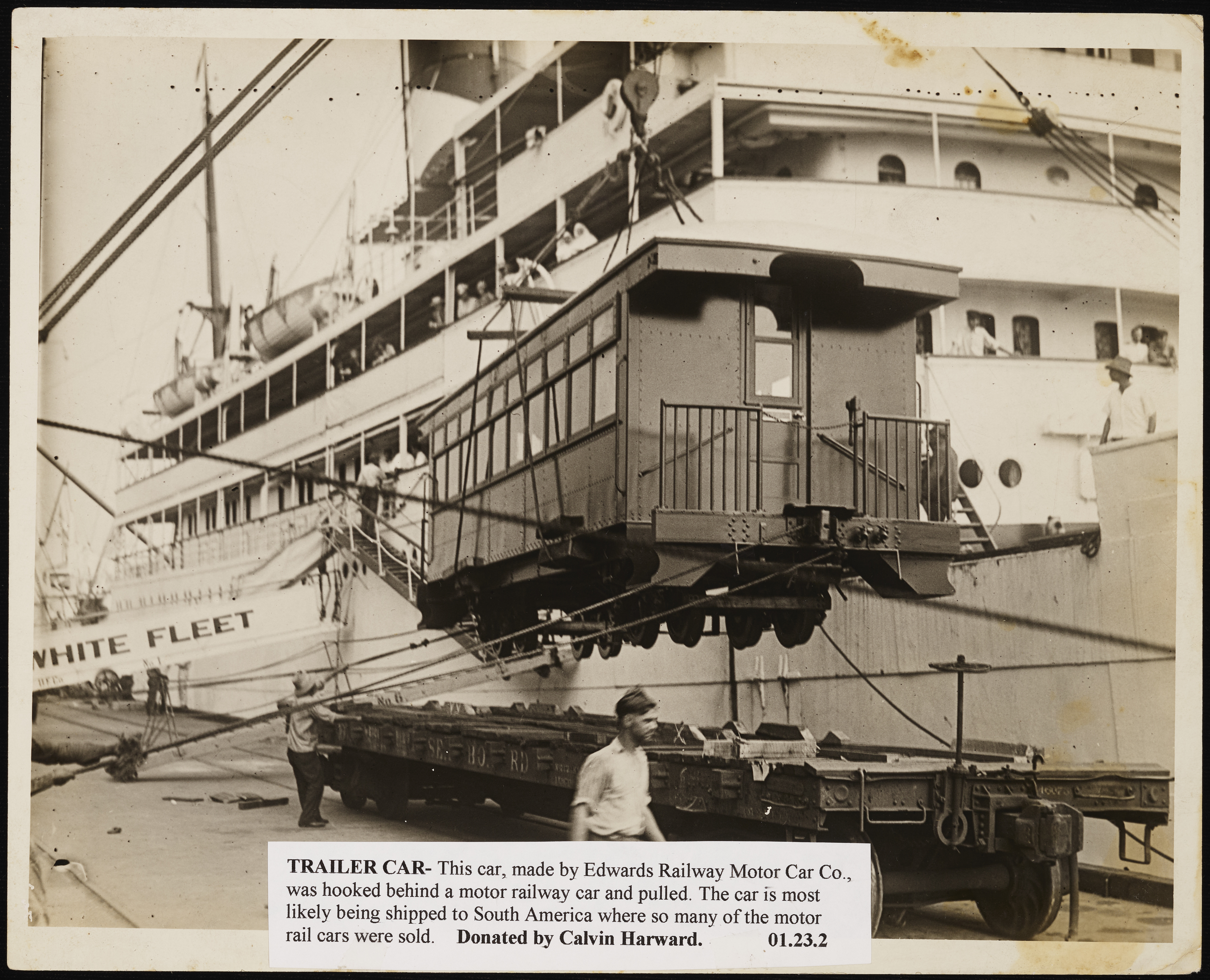 Trailer car, made by Edwards Railway Motor Car Co., hooked behing a motor railway car and pulled. The car is most likely being shipped to South America where so many of the motor rail cars were sold. Donated by Calvin Harward.