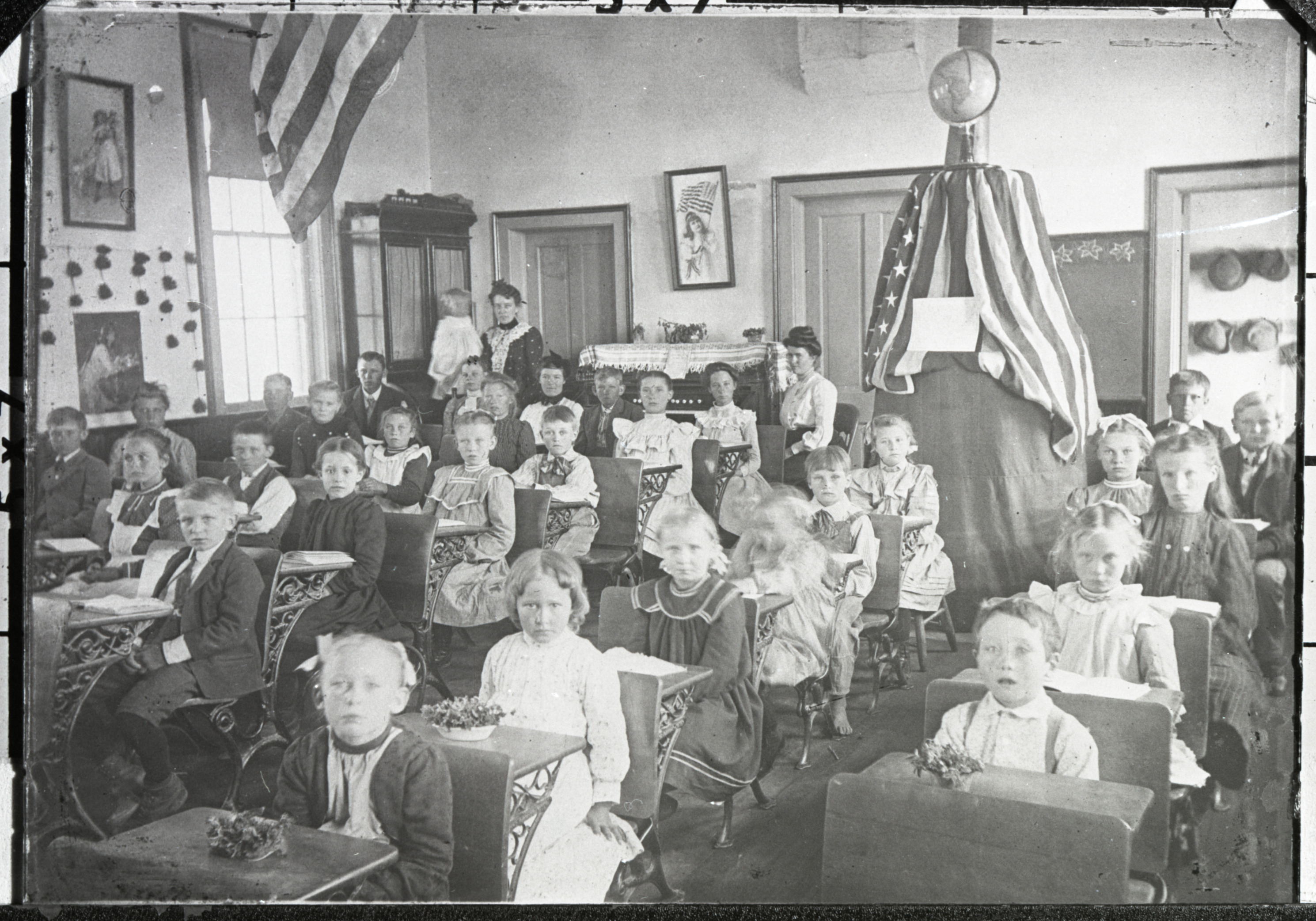 A large group of school children sitting at their desks with two teachers in the back. Negative appears to be a photograph of a photograph.