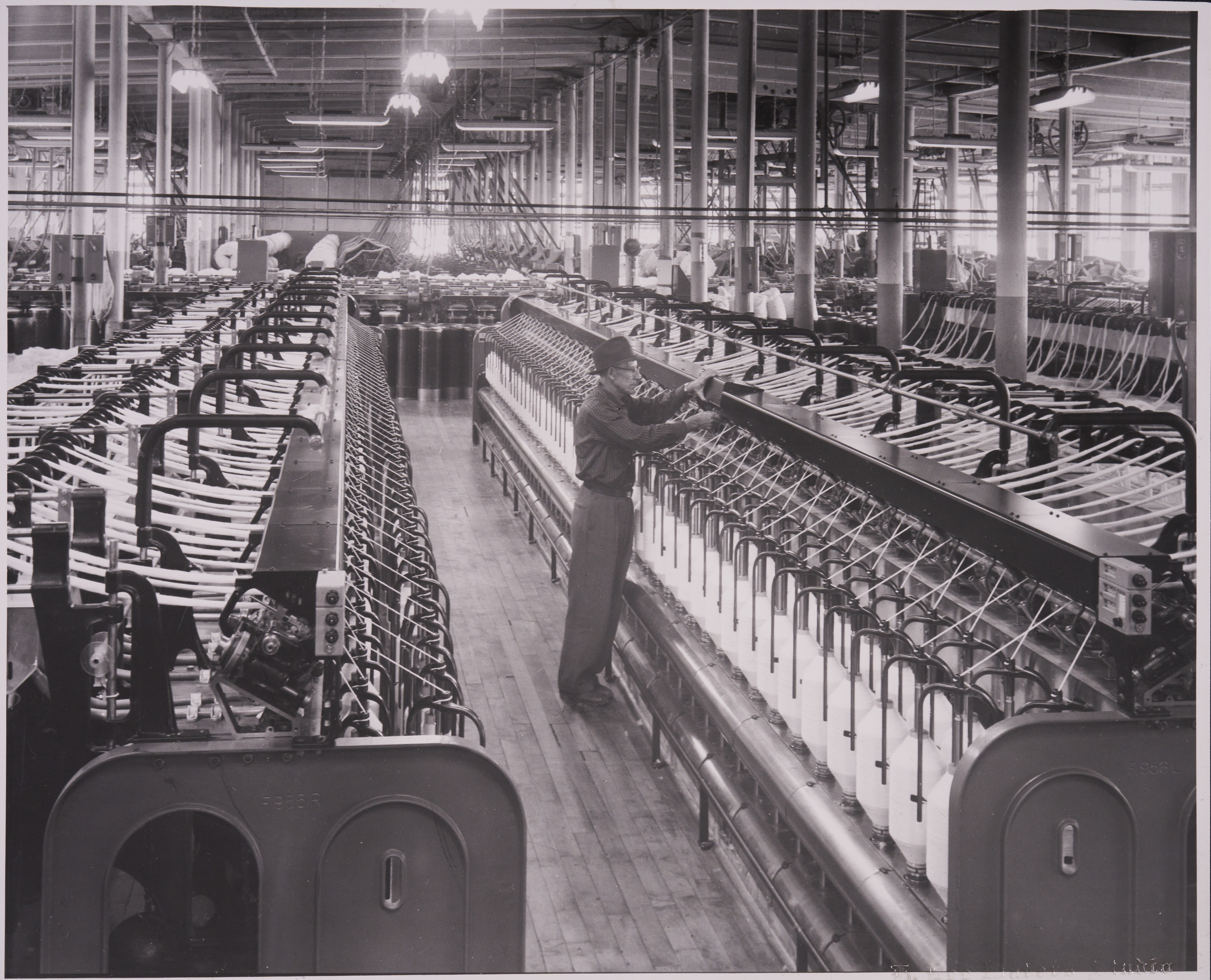 Man at Dacotah Mill working in an aisle between spinning machinery. "Dacotah Mill Co." written on the original envelope.