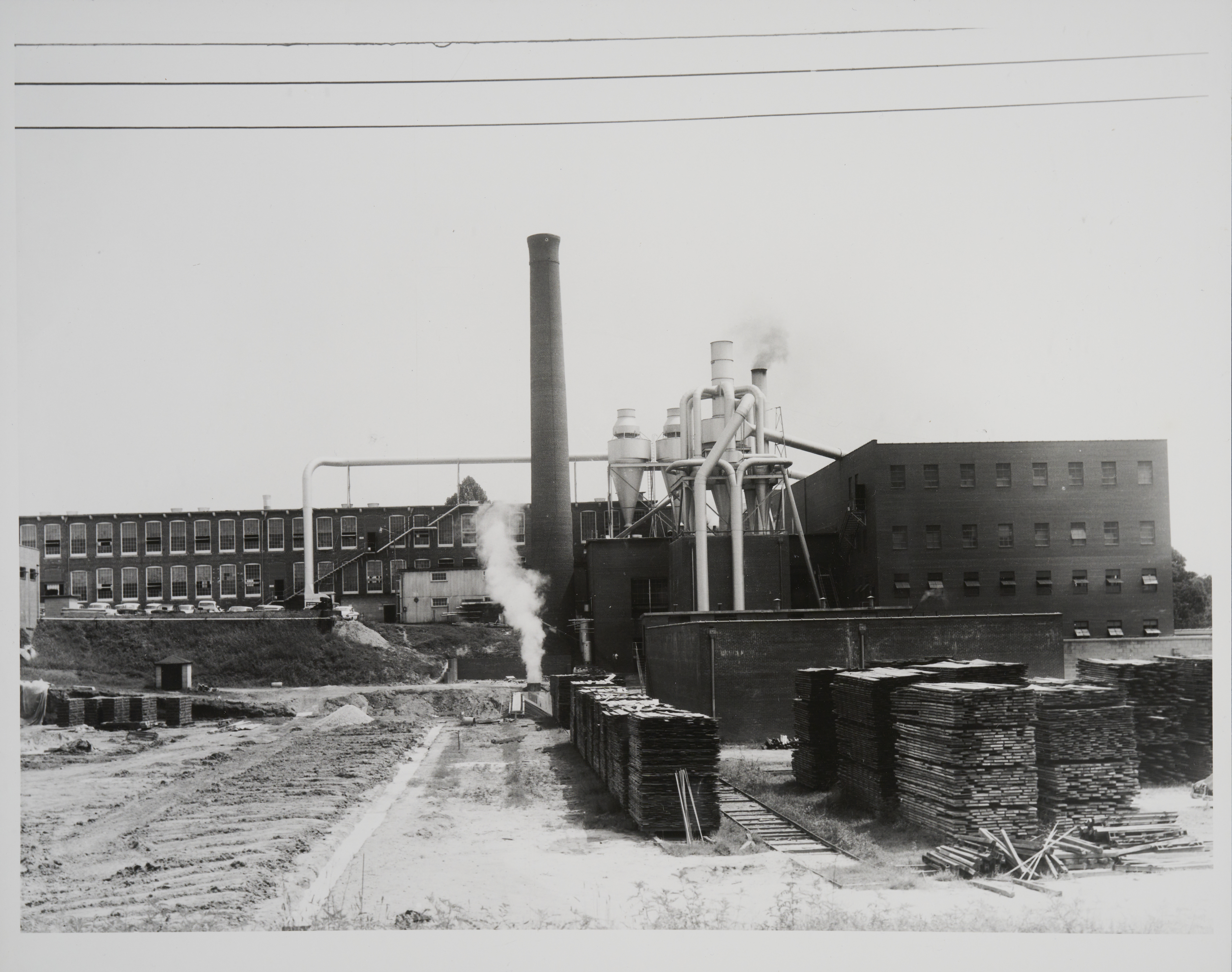Rear view of United Furniture Company factory buildings and construction. Large stacks of lumber are visible behind the small brick building that sits to the far right.
